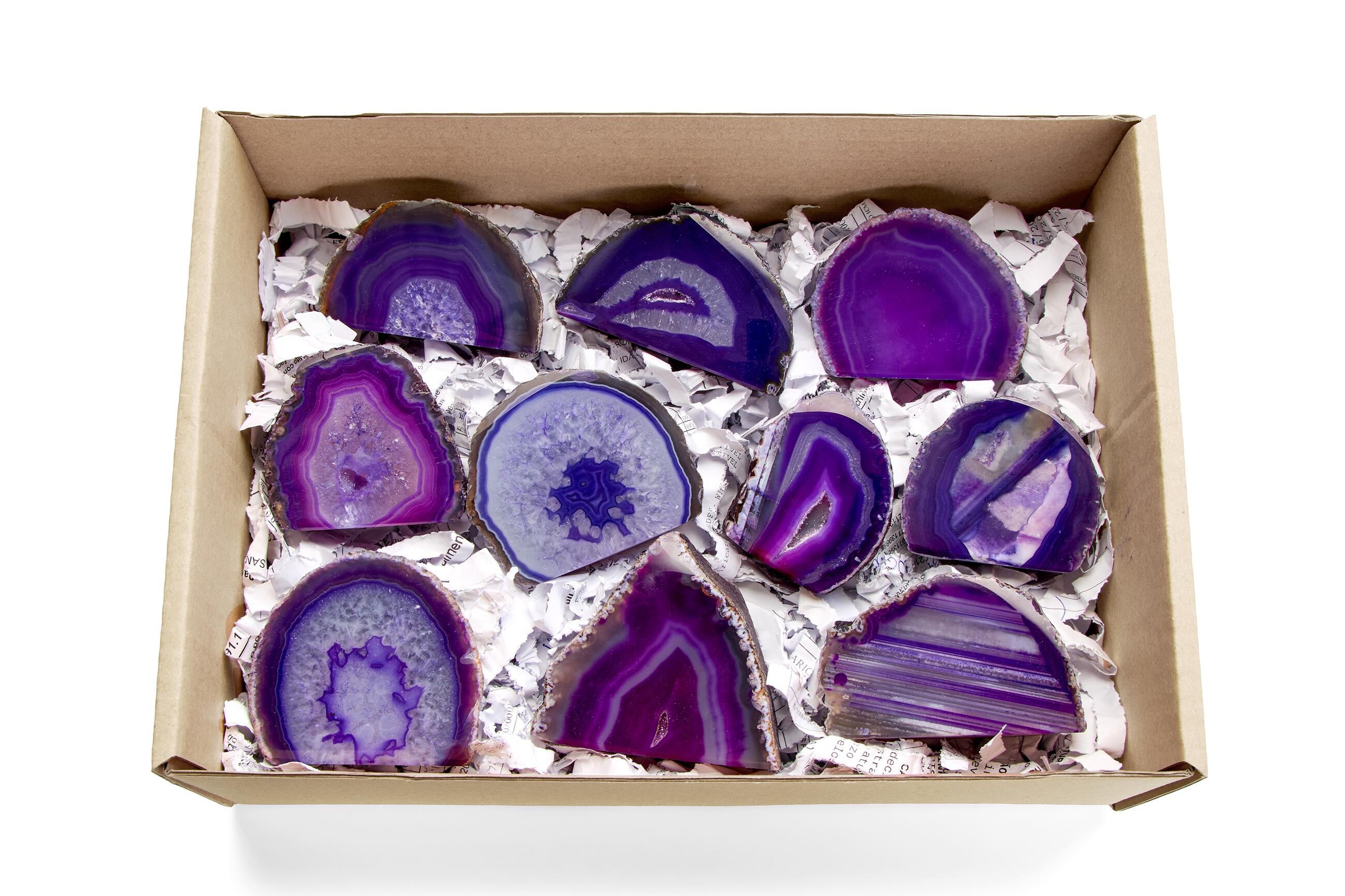 The intensity of agate patterns is often boosted by dyeing. Agates are porous and have good ability to absorb liquids. During the dyeing process, the liquid soaks into individual layers of agate according to the level of their porosity. These agates are purple dyed.