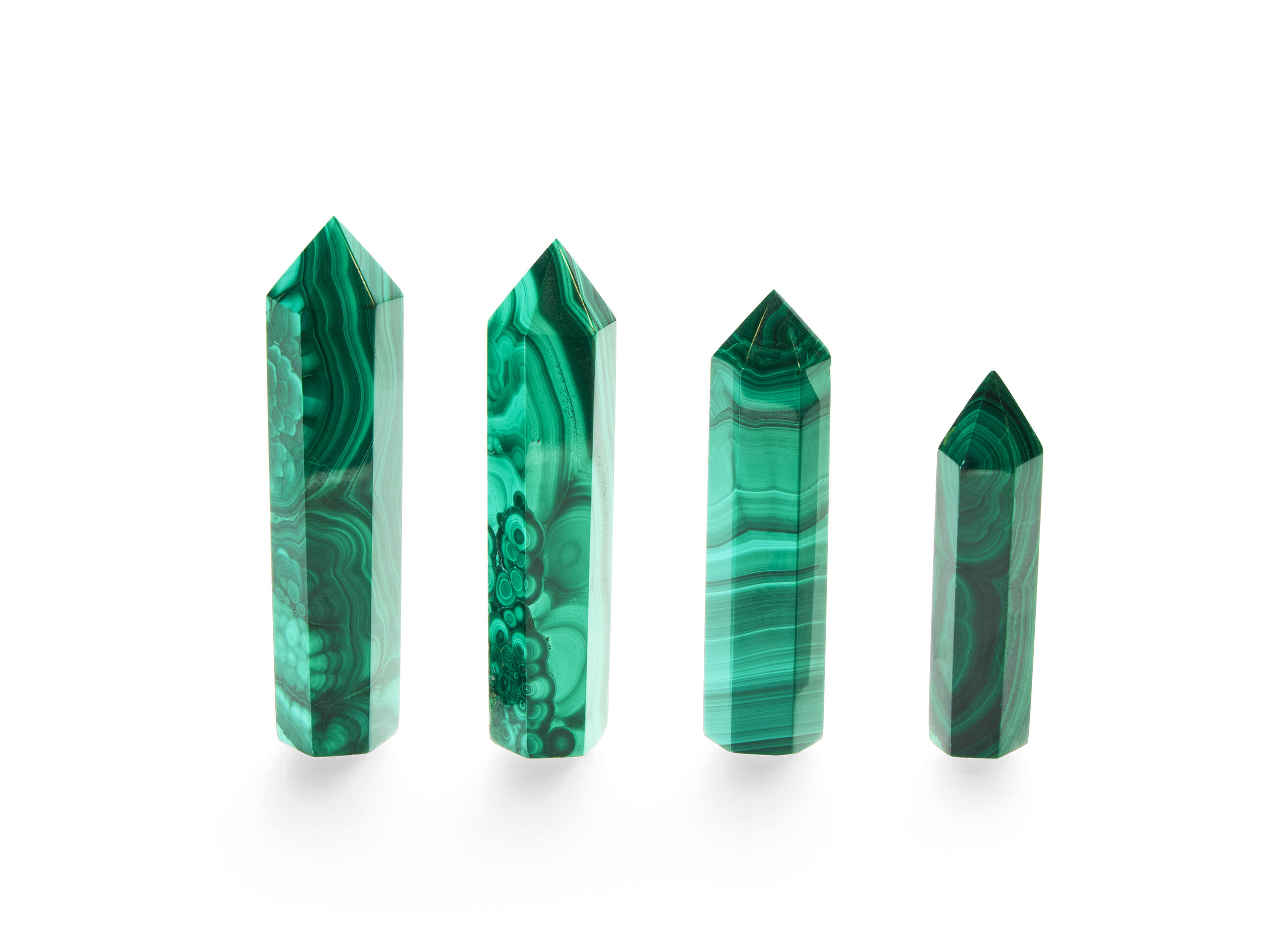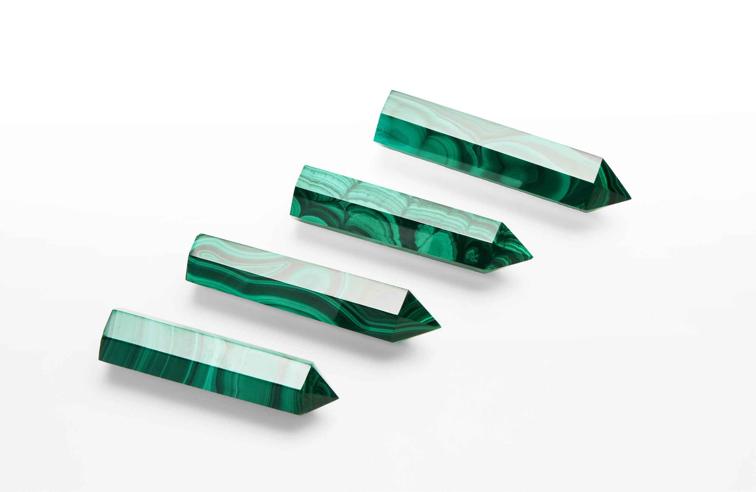 About the product: Malachite has been cut and smoothed out into a hexagonal point. Its base has been cut flat to make it stand solidly. The product is sold by weight; the price is per 1 kg. Points are approximately 6 - 8 cm long and their weight ranges approx. between 30 and 50 g.