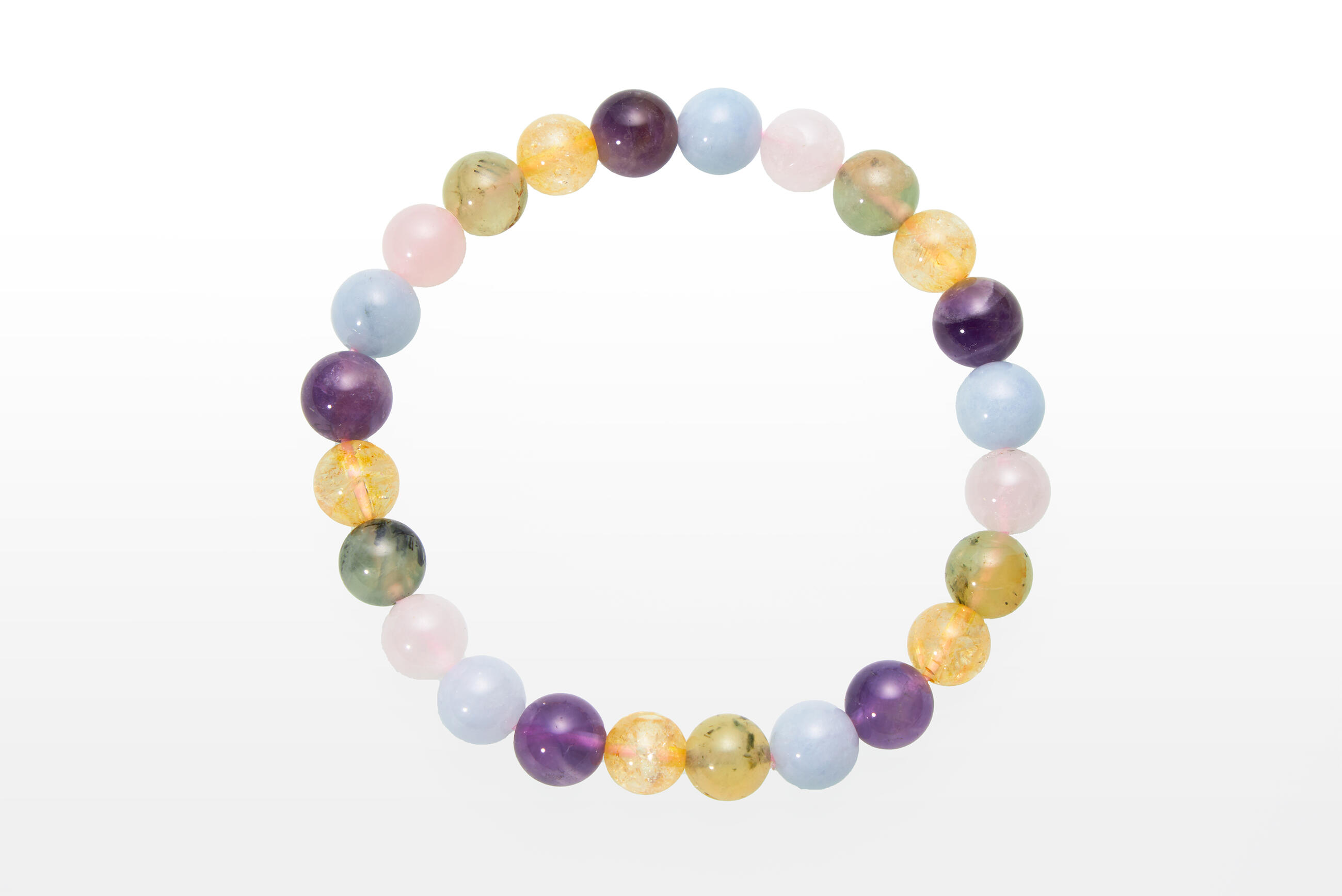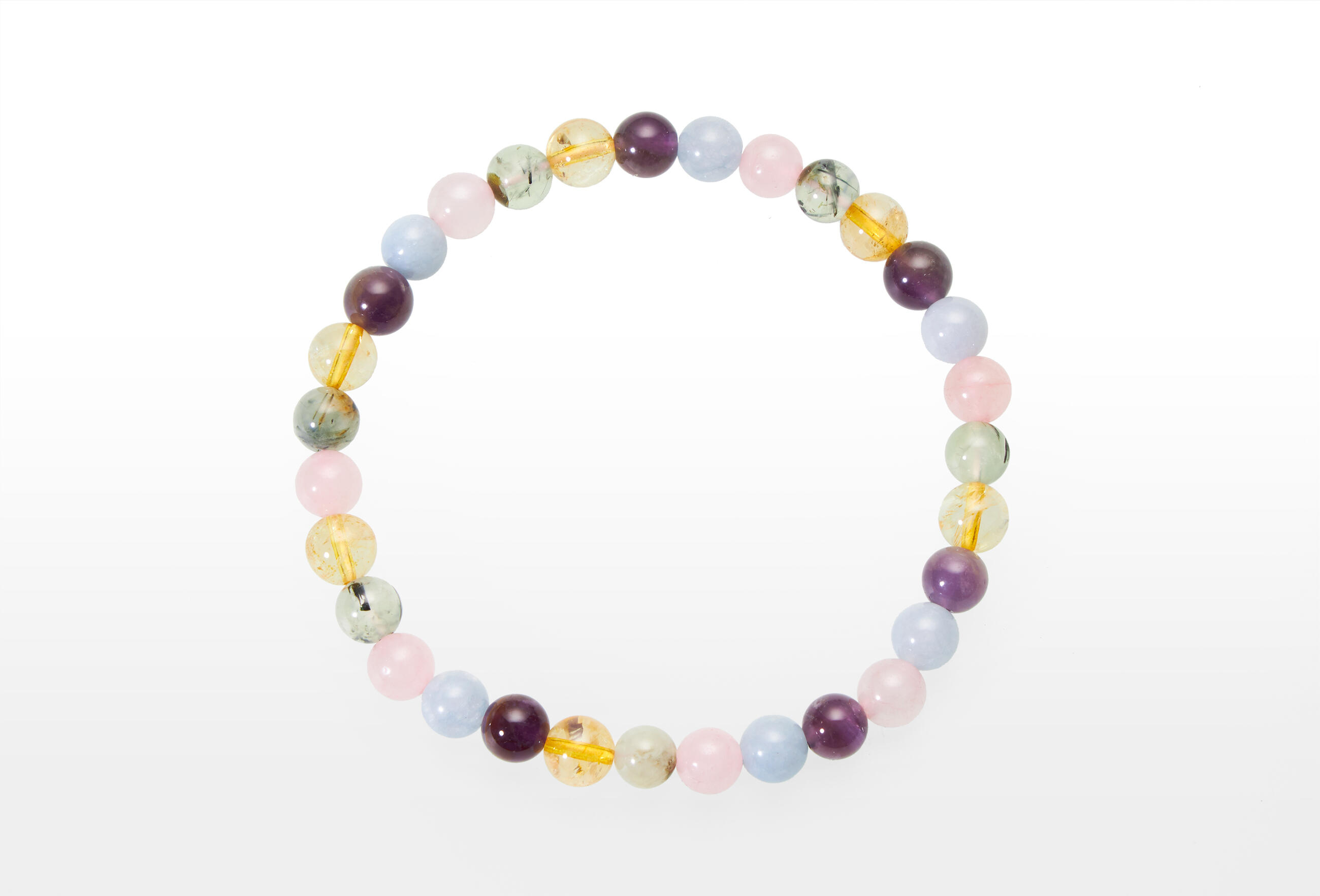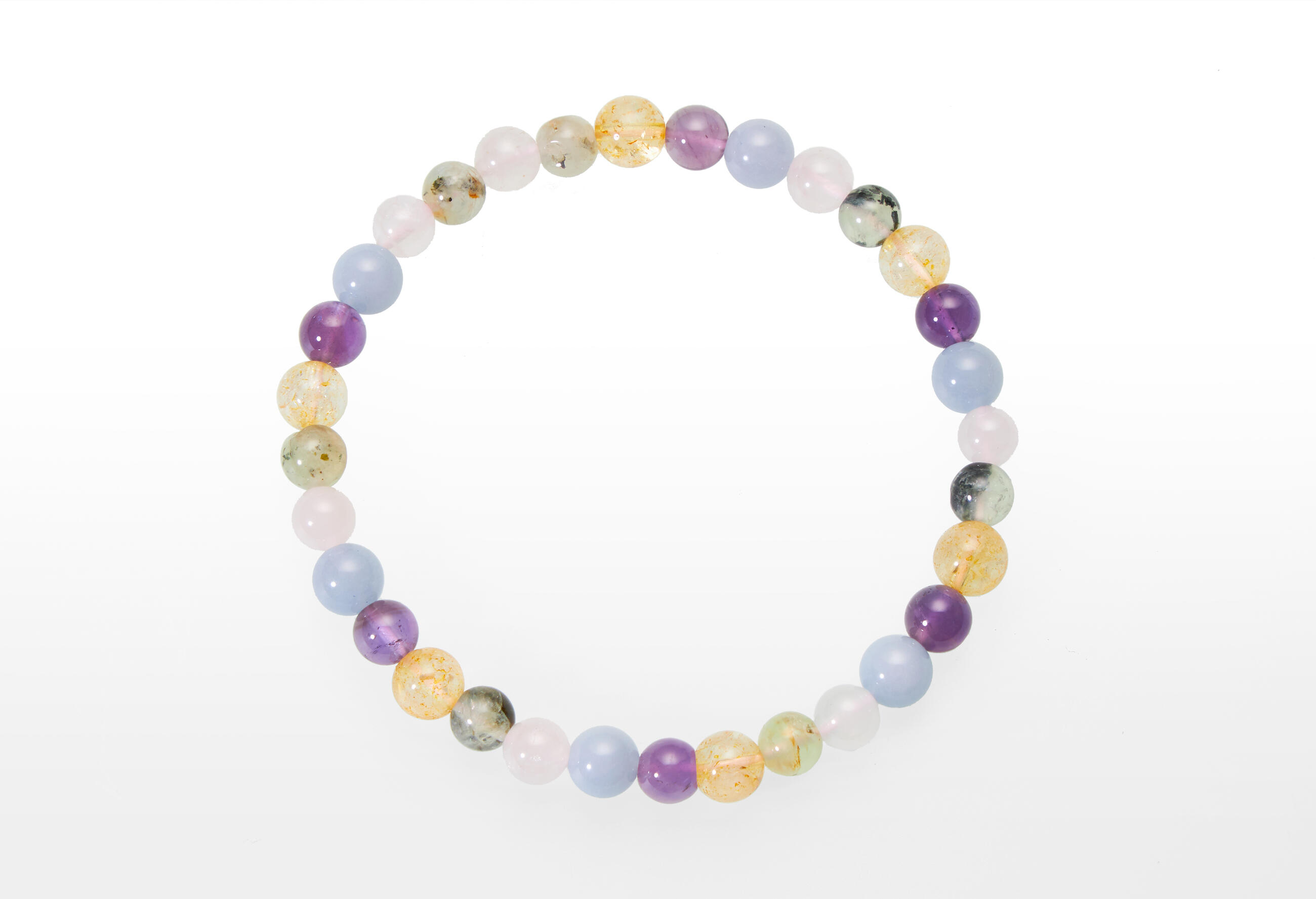On this bracelet you will find a combination of rose quartz, amethyst, citrine and aquamarine beads.