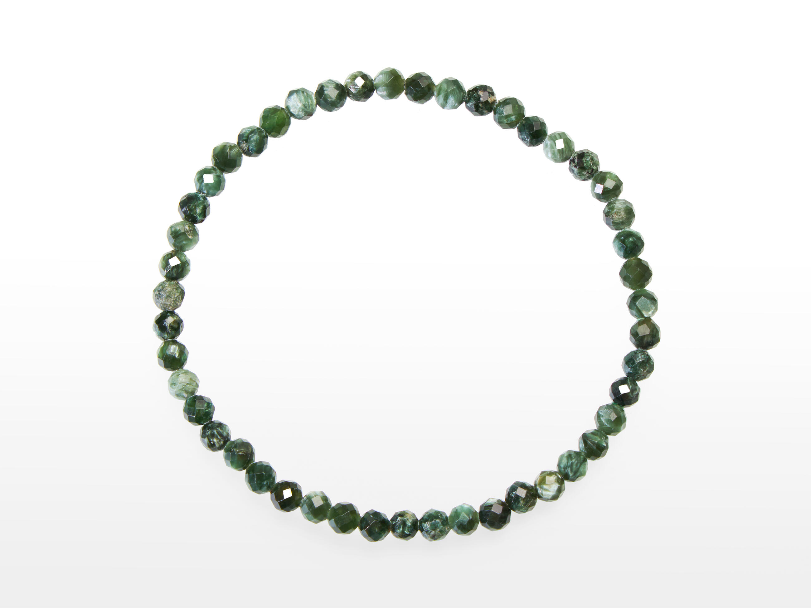 Seraphinite is also called the Angel stone. It catches one’s eye with its grey-green to green-black colour highlighted by a silky lustre. You may sometimes find pieces with striking patterns resembling a bird’s feather. This rare mineral can be found in a single deposit – the Lake Baikal area in Russia. If we look at its chemical structure, seraphinite is a gemstone variety of clinochlore, which is chlorite from a group of silicates resembling micas.