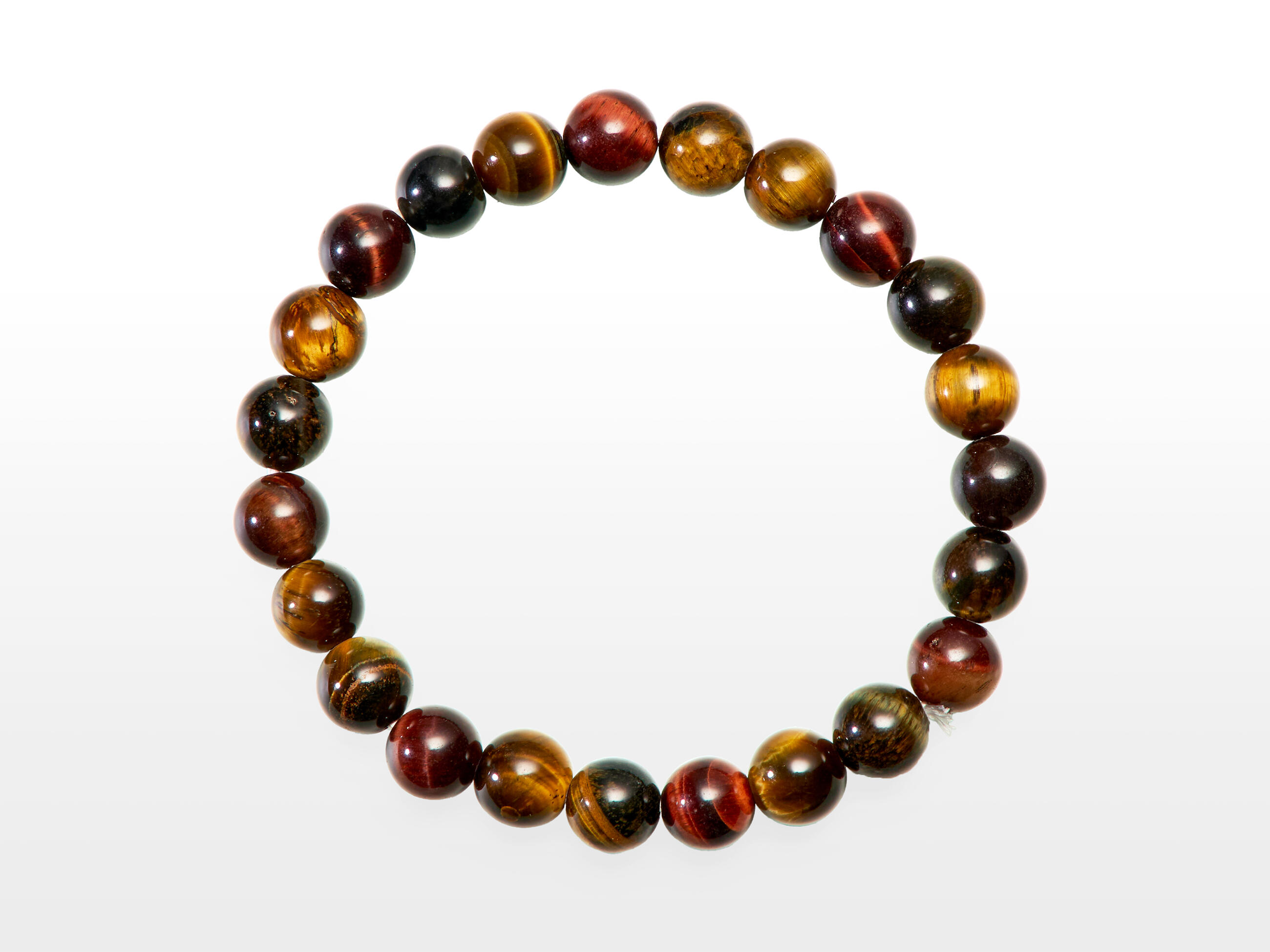 The bracelet contains a colourful combination of tiger´s eye, bull´s eye (red tiger´s eye) and falcon´s eye (blue tiger´s eye) beads. Tiger’s eye is captivating for its yellow, to yellow-brown design with a silky lustre. For its charming look, tiger’s eye is used in jewellery and exclusive statuettes production. Out of the few deposits in the world, the Doorn Mountains in South Africa are the most famous one, and it is where our raw material is from. If we look at its chemical structure, tiger’s eye is quartz with fibres of crocidolite asbestos (fibrous variety of riebeckite) growing in its structure.