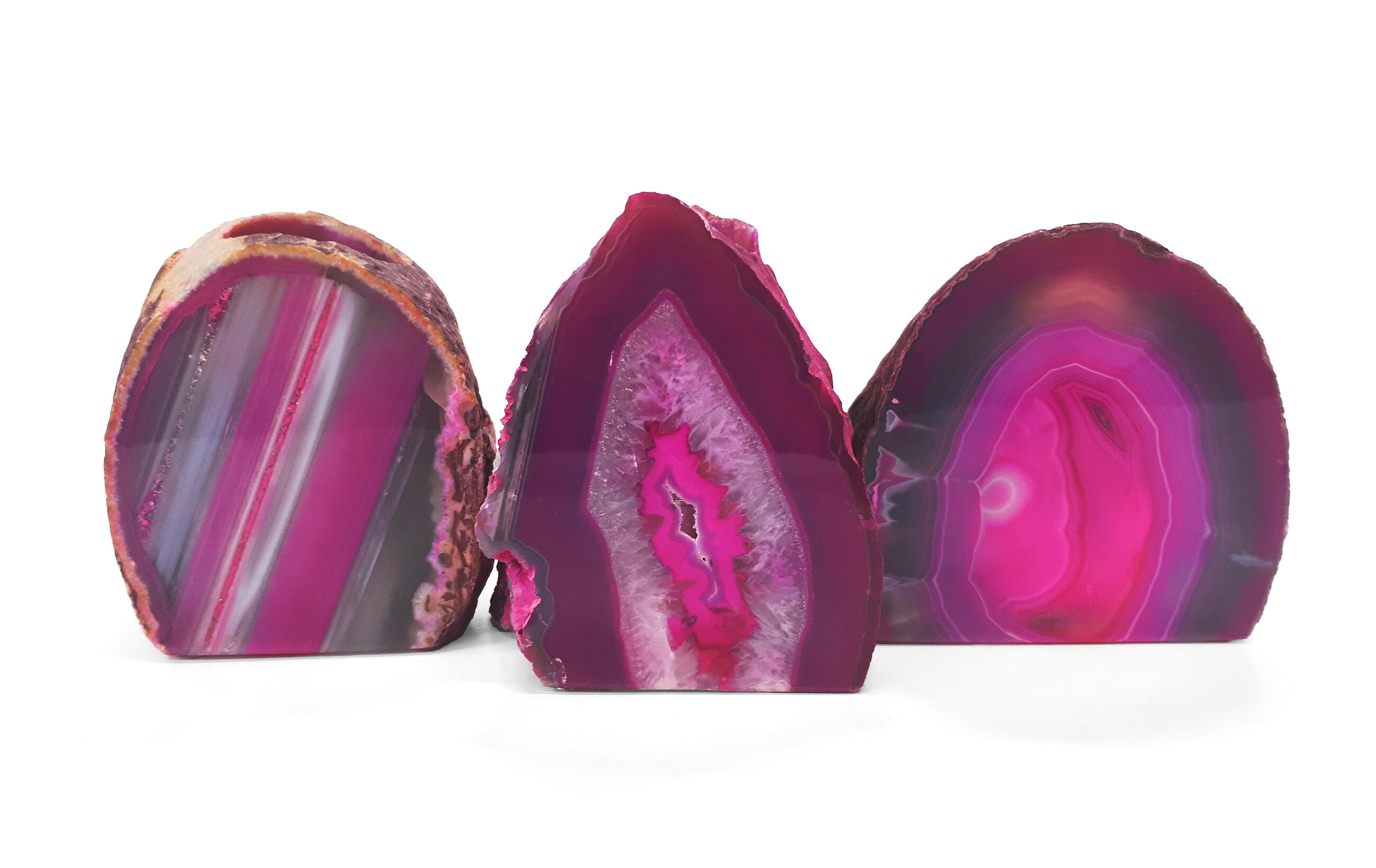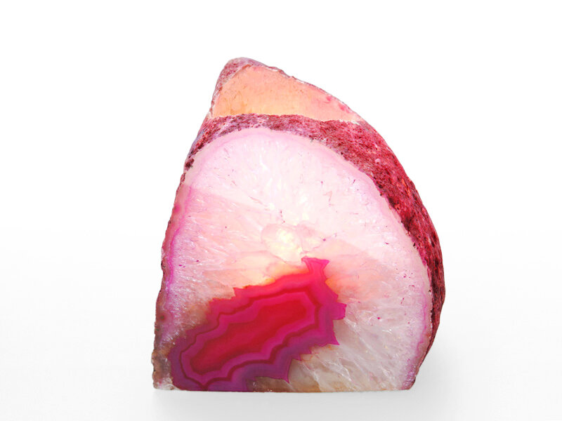Stone uniqueness: Brazilian agates´s colour is often highlighted by charming banded lines. Such design can only form thanks to the high porosity of agate and its ability to absorb liquids. Agate is often dyed with cold solutions; this process takes up to several weeks before the stone soaks up the dye. This agate has been dyed pink.