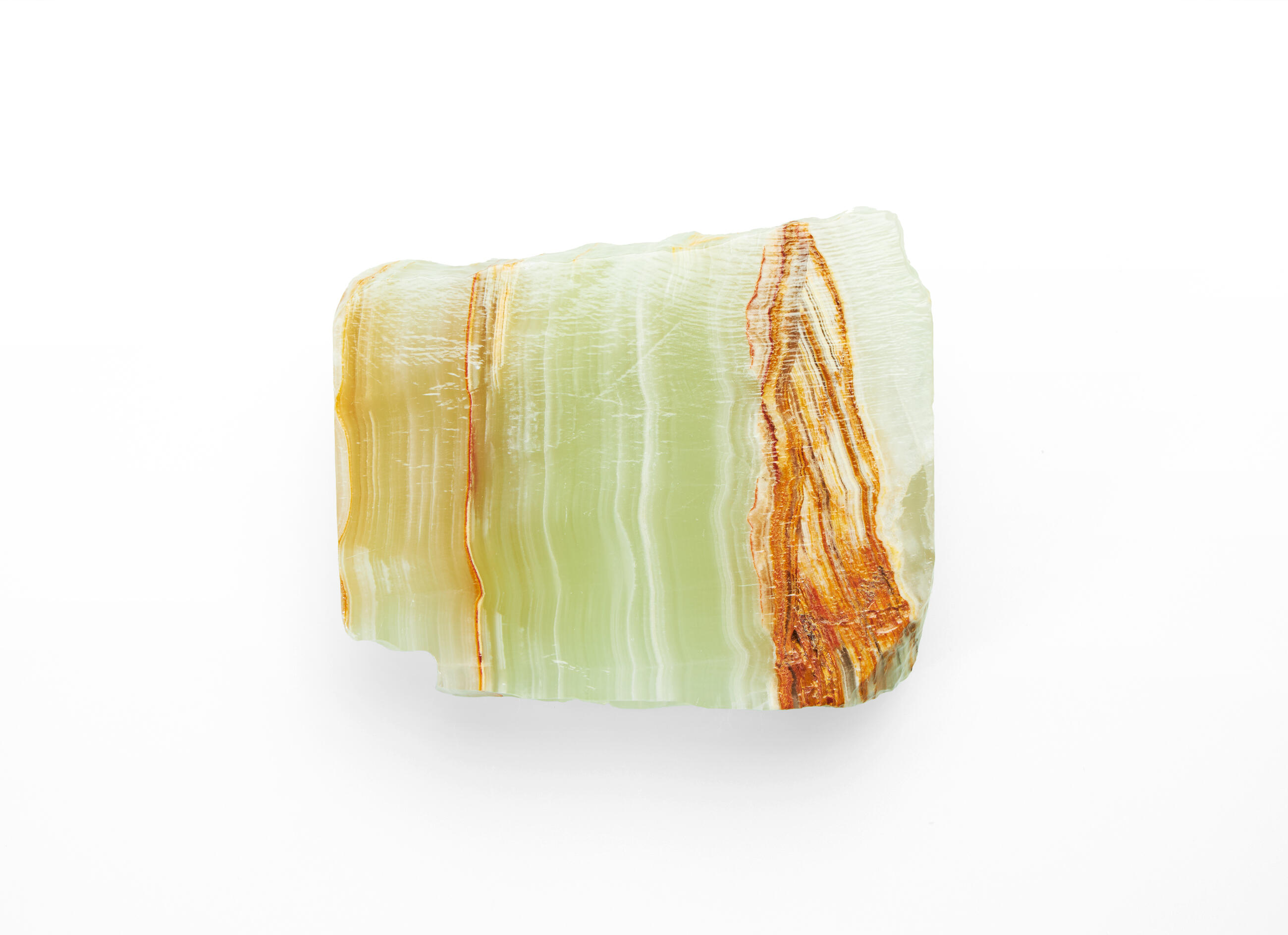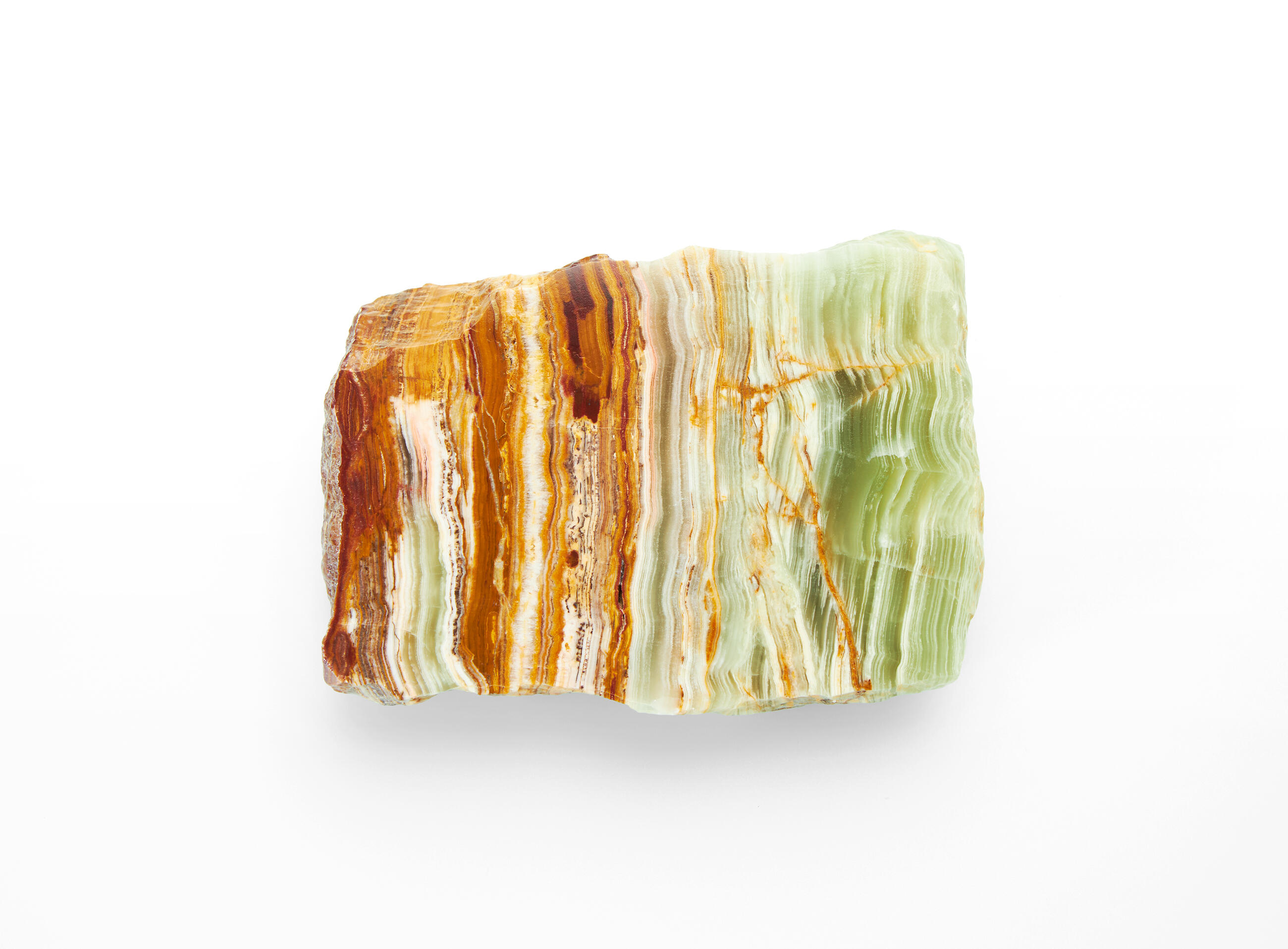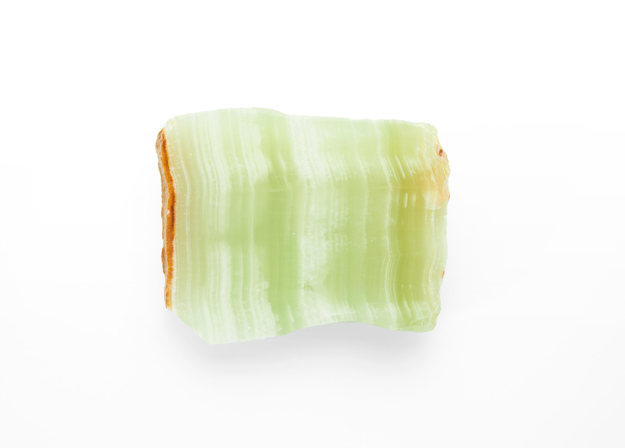 If we look at aragonite's chemical structure it is calcium carbonate. The stone´s typical shades are green, yellow-green, white or brown. Our stones come from Pakistan. The specificity of Pakistani aragonite is alternating striping with strong contrasts.