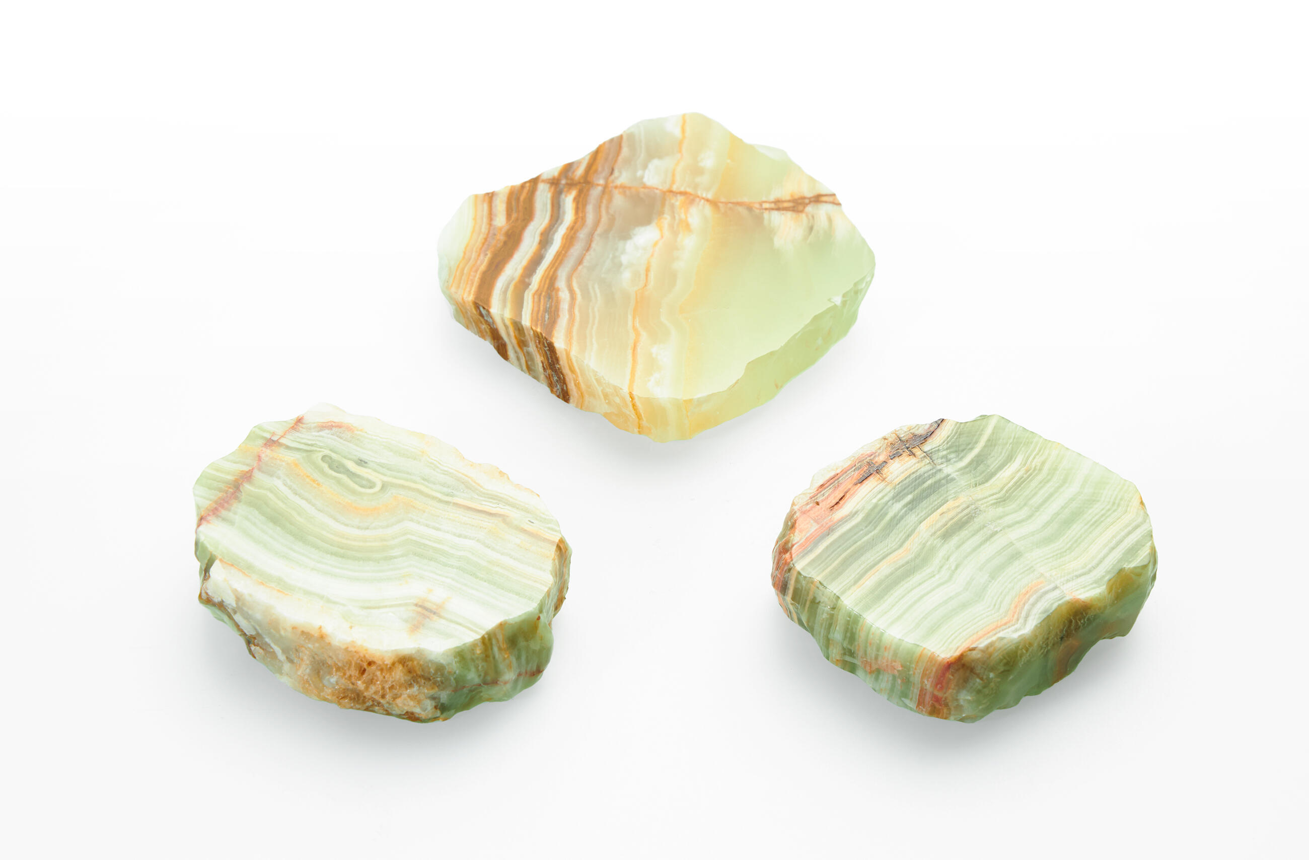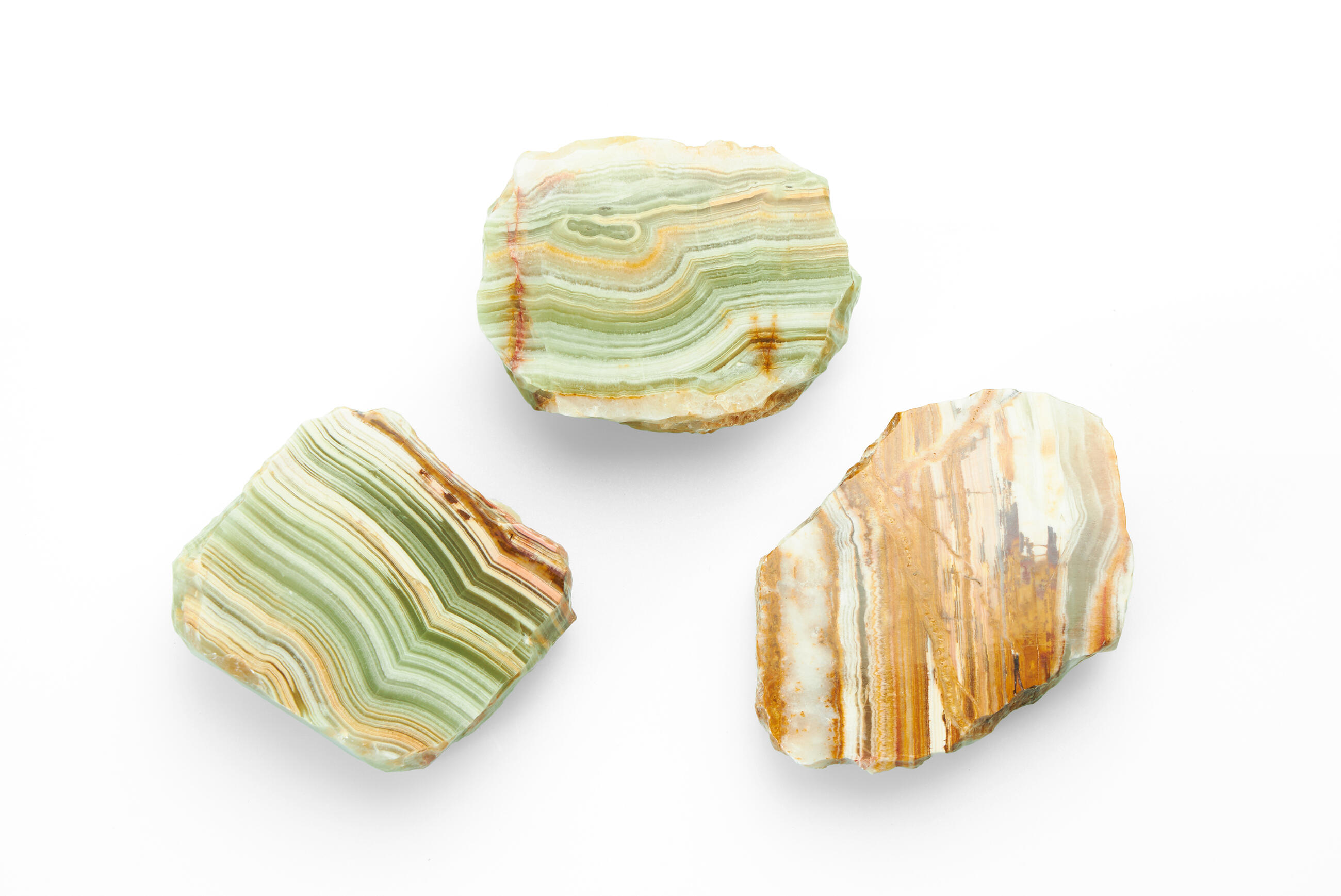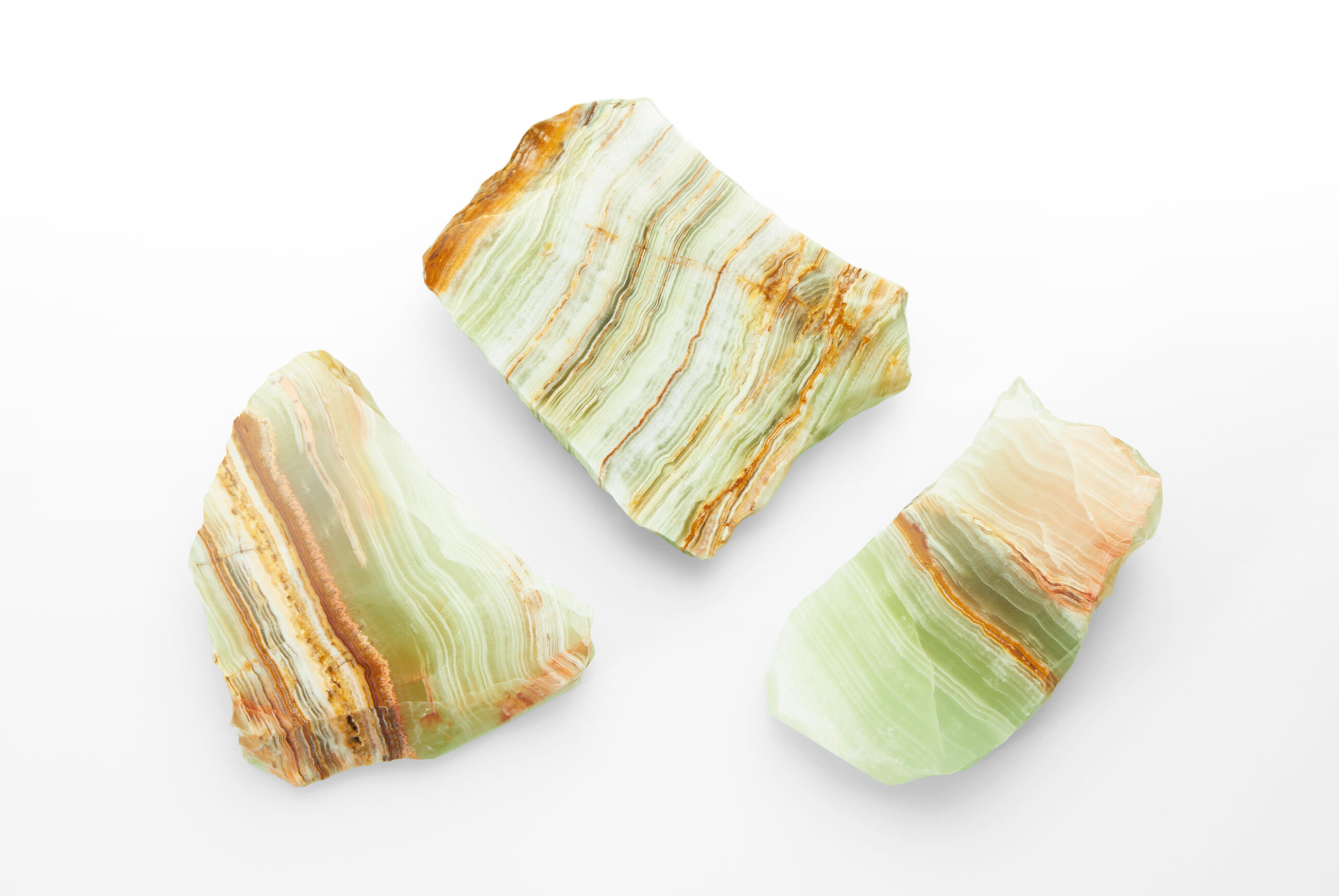 If we look at aragonite's chemical structure it is calcium carbonate. The stone´s typical shades are green, yellow-green, white or brown. Our stones come from Pakistan. The specificity of Pakistani aragonite is alternating striping with strong contrasts.