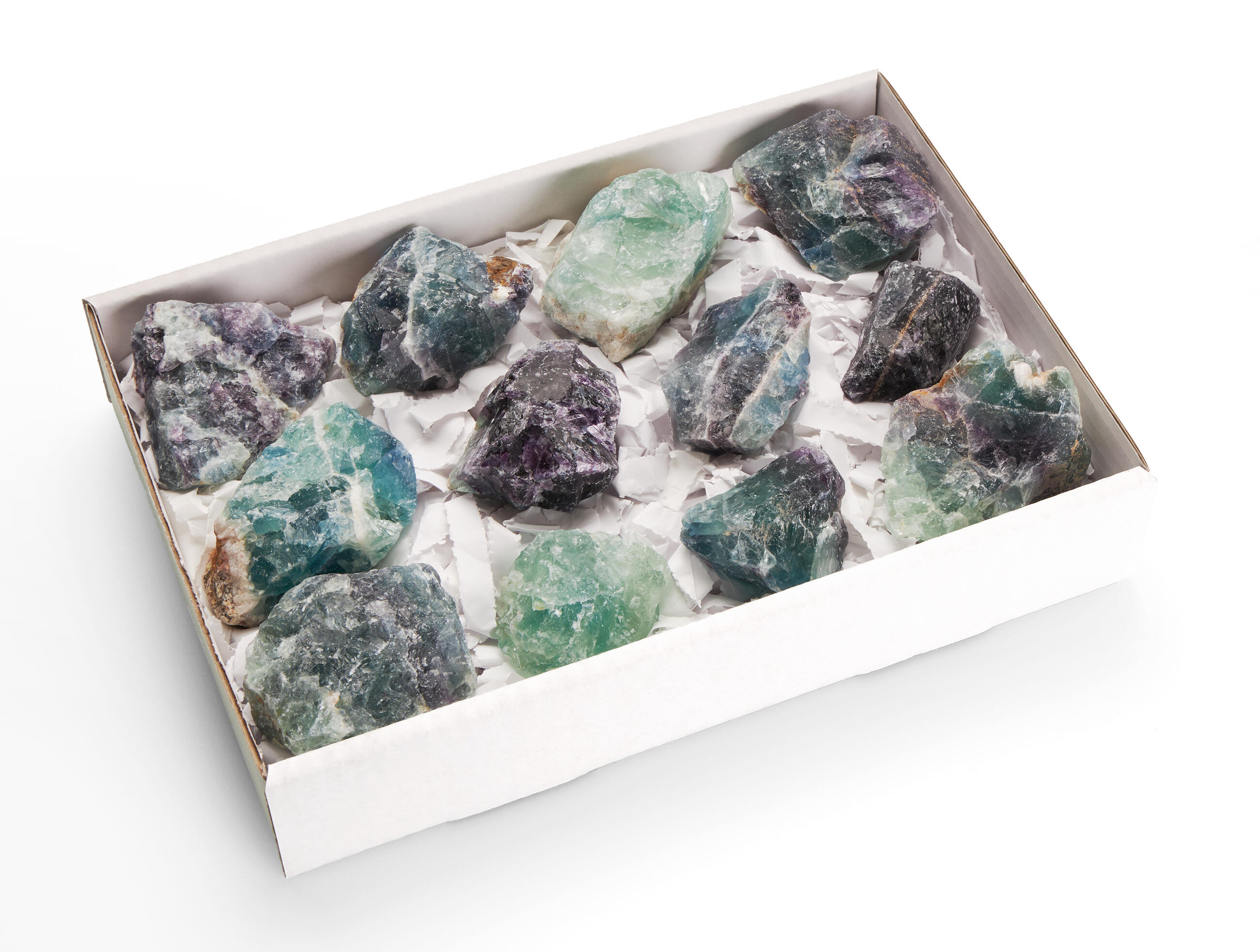 Fluorite is a very fragile and fissile stone requiring special treatment. If we look at its chemical structure, fluorite is calcium fluoride. It is a widespread mineral, which forms mainly in hydrothermal veins. As its name suggests, green fluorite comes in beautiful shades of green, making it a very popular item for collectors. Our rough fluorite comes from the Sichuan province in China.