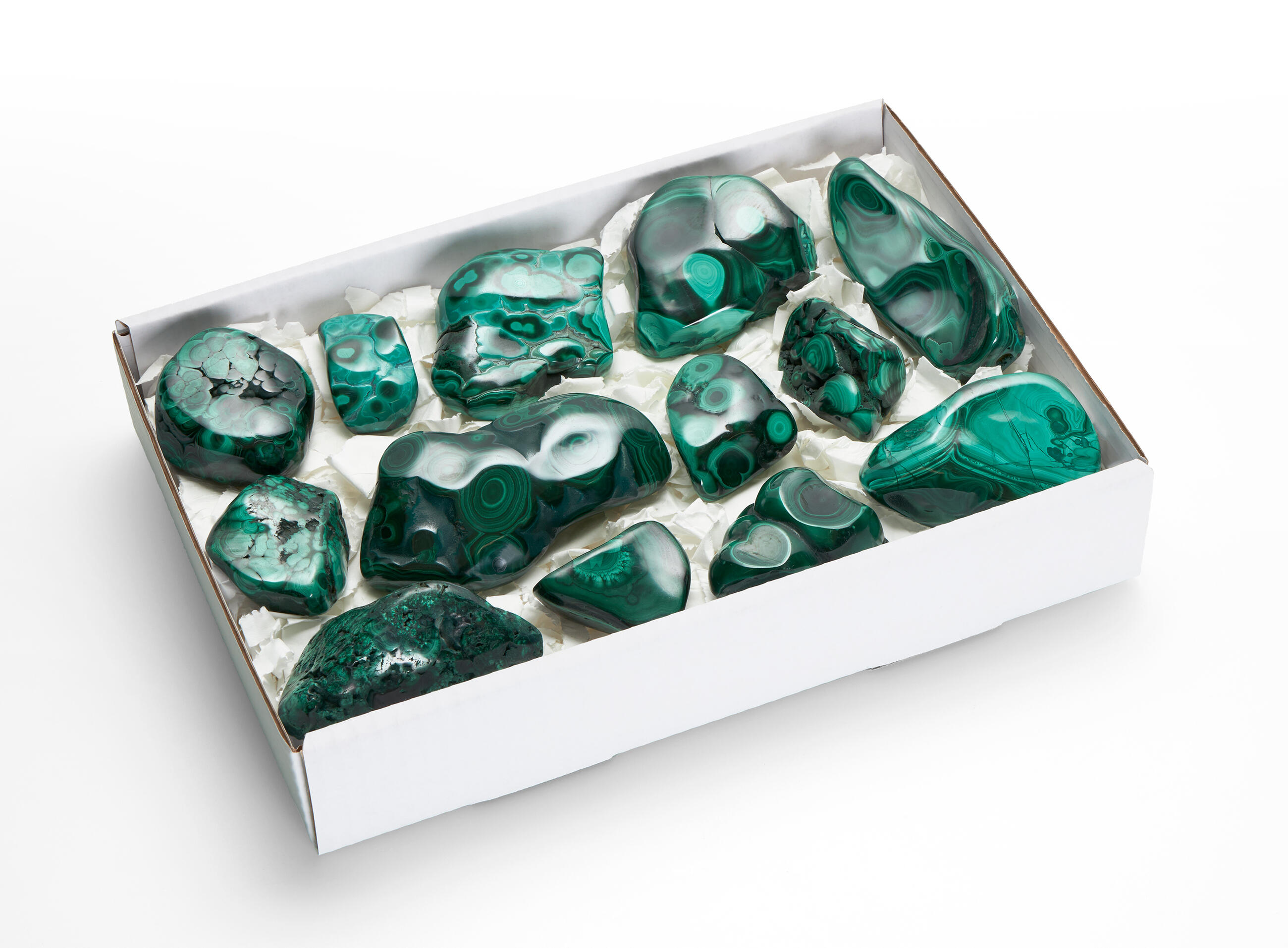 About the product: The box contains manually polished malachites. The price is per 1 box. Stones are carefully arranged into three-layered paperboard boxes - these are firm and resistant, which makes them easy to store. The boxes are wrapped into stretch cling, which prevents them from damage. Folded boxes provide a complex presentation of our minerals.