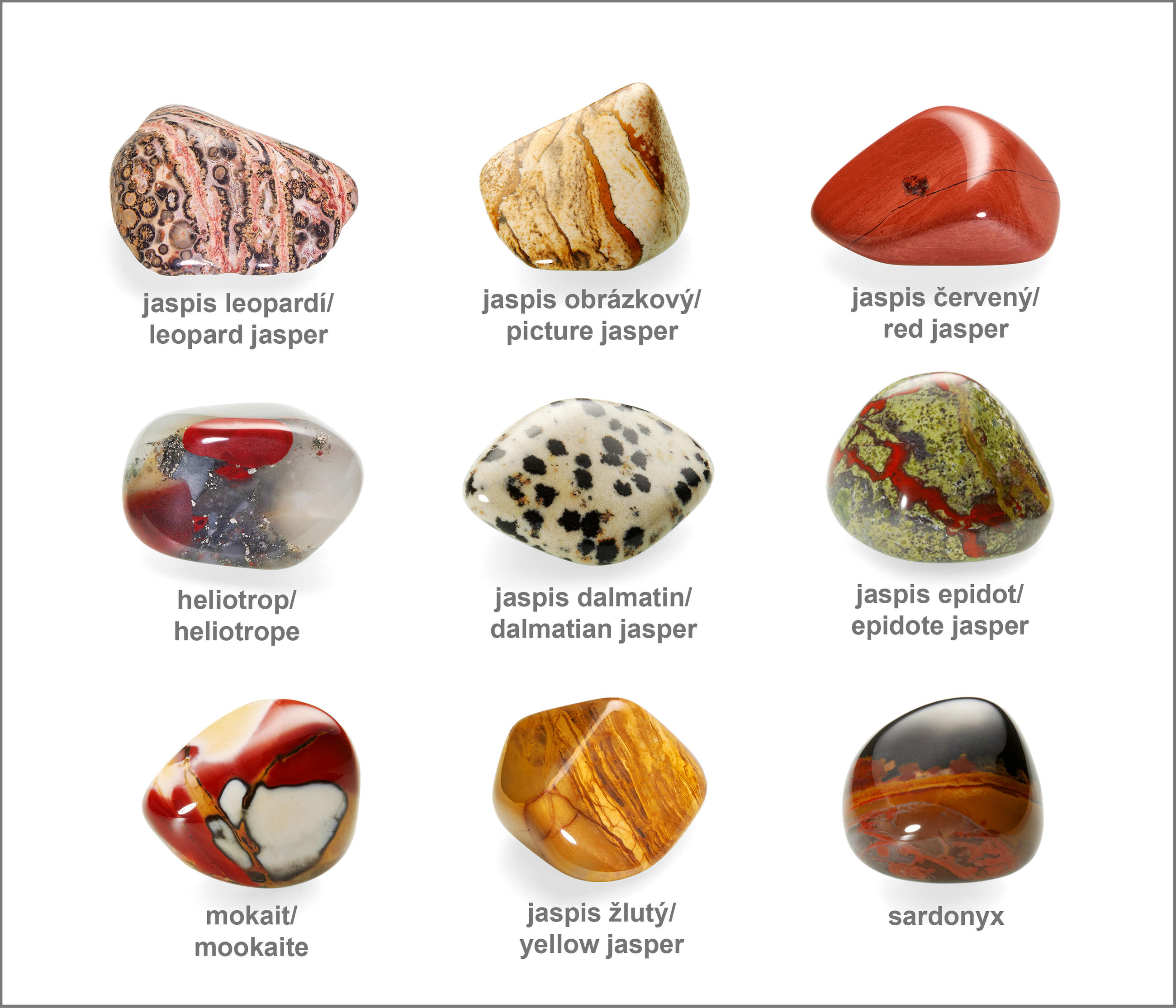 In each set, you will find these 9 popular varieties of jasper: leopard jasper, picture jasper, red jasper, heliotrope, dalmatian jasper, epidote jasper, mookaite, yellow jasper and sardonyx.