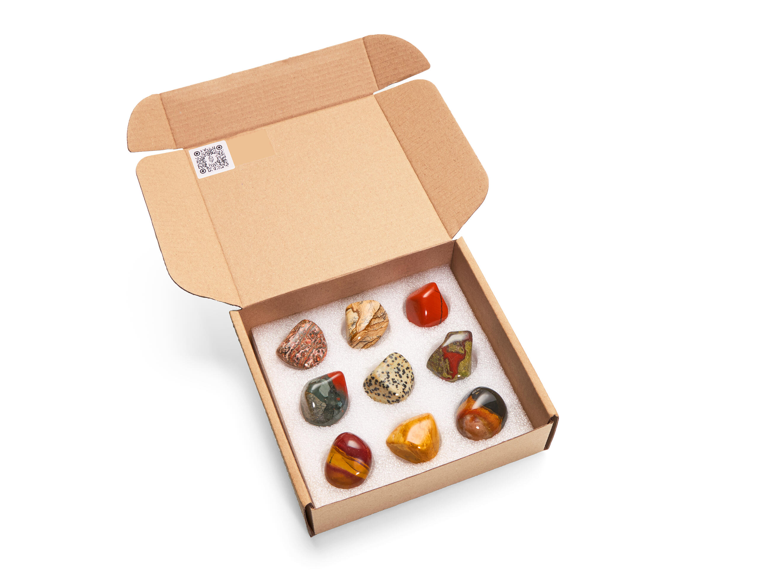 Collector´s set JASPER contains nine tumbled stones in size XL, each stone represents a different variety of jasper. Their names, descriptions and locations are on a website that customers can access by scanning the QR code on the box.