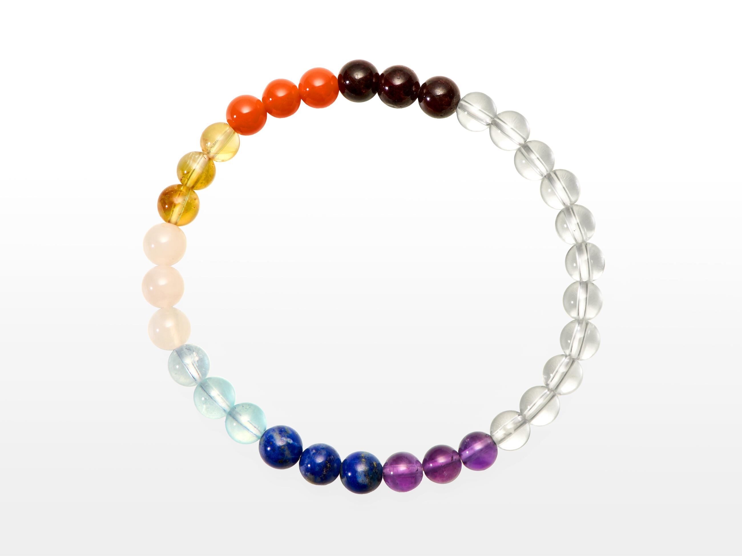 Chakra bracelet features several gemstone varieties with supposedly healing properties. Its colours correspond to individual chakra centres in our body.