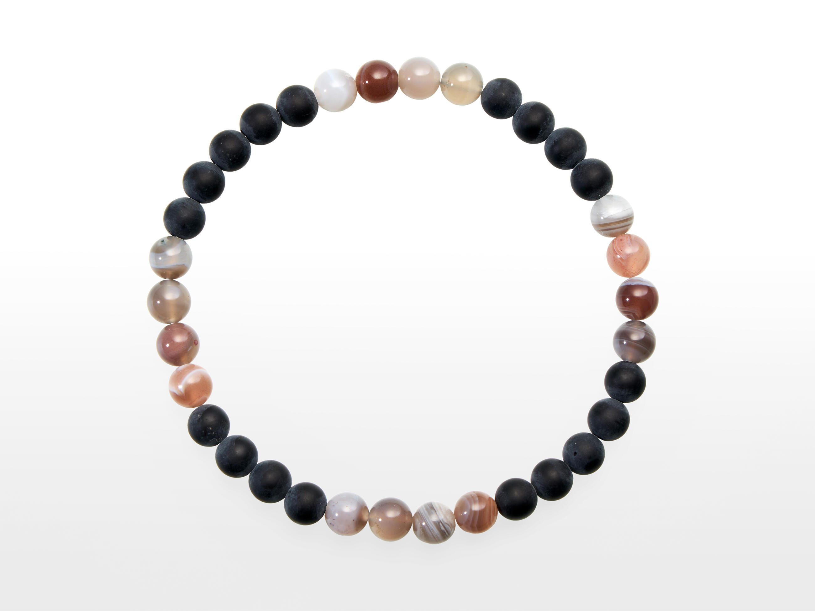 Onyx is a rare, black or black-white mineral with banded lines. Its deposits are in India and Brazil, but since the stone is hard to find in its natural form, it is often substituted with dyed agates. However, in the long history of onyx (it was popular in ancient times), people used it for engraved gems (small engravings in hard material) and intaglios (gems with a design cut deep in the surface of the stone). Rings and amulets made from onyx served as seals. The raw material comes from Brazil. If we look at its chemical structure, onyx is a variety of chalcedony, which is a general name for fibrous, cryptocrystalline quartz. On this bracelet, matt onyx is combined with shiny Botswana agate beads.