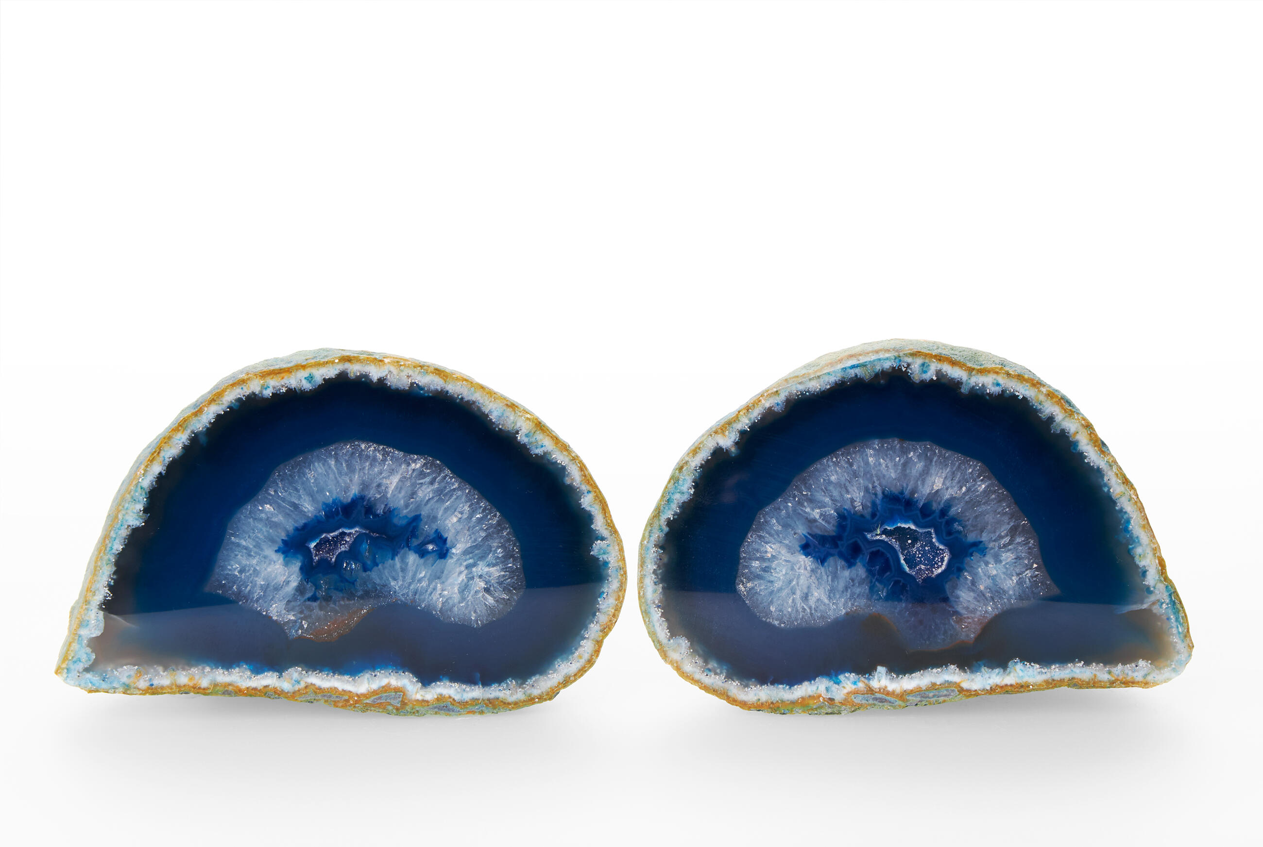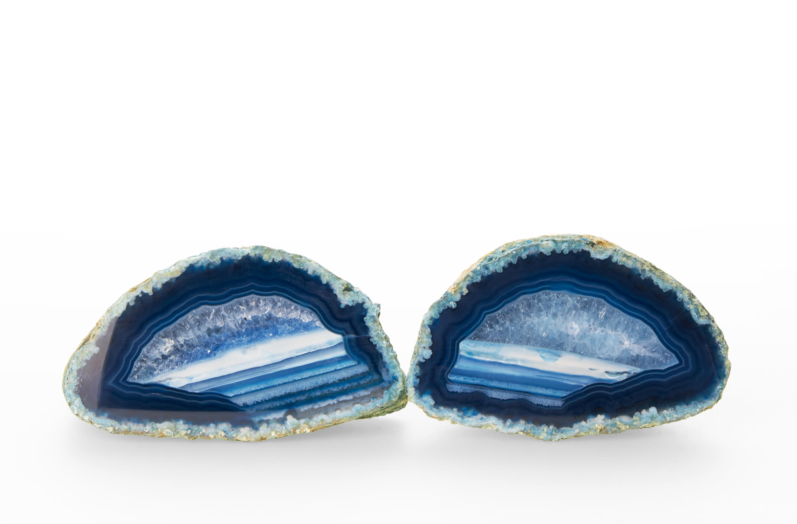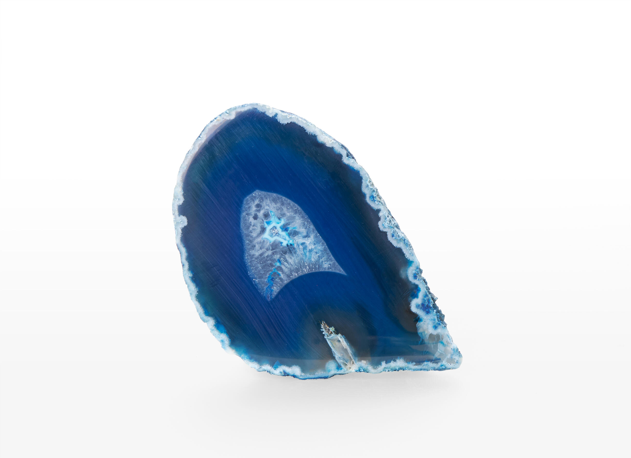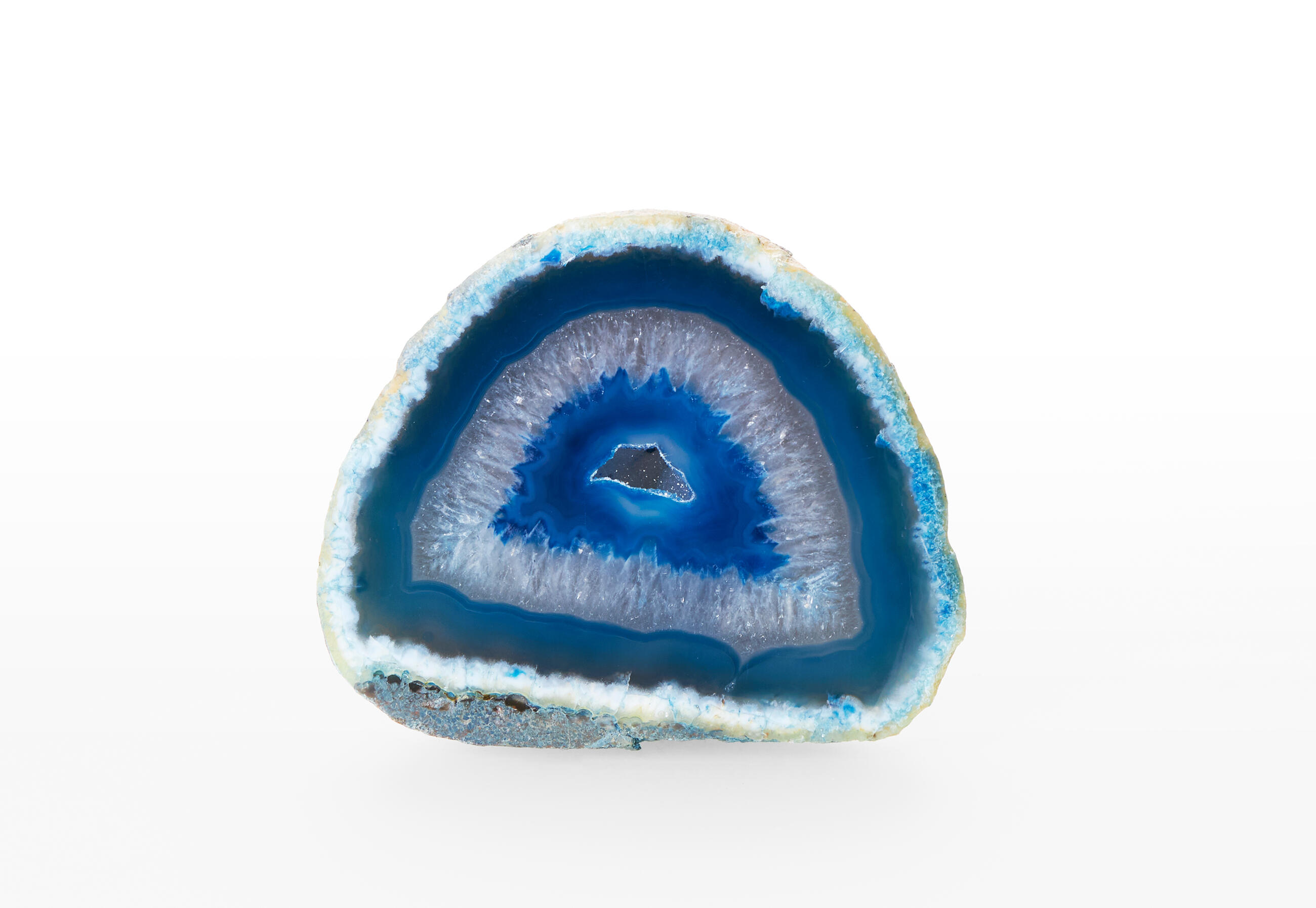 The intensity of agate patterns is often boosted by dyeing. Agates are porous and have good ability to absorb liquids. During the dyeing process, the liquid soaks into individual layers of agate according to the level of their porosity. These agates are blue dyed with cool-dye solutions.