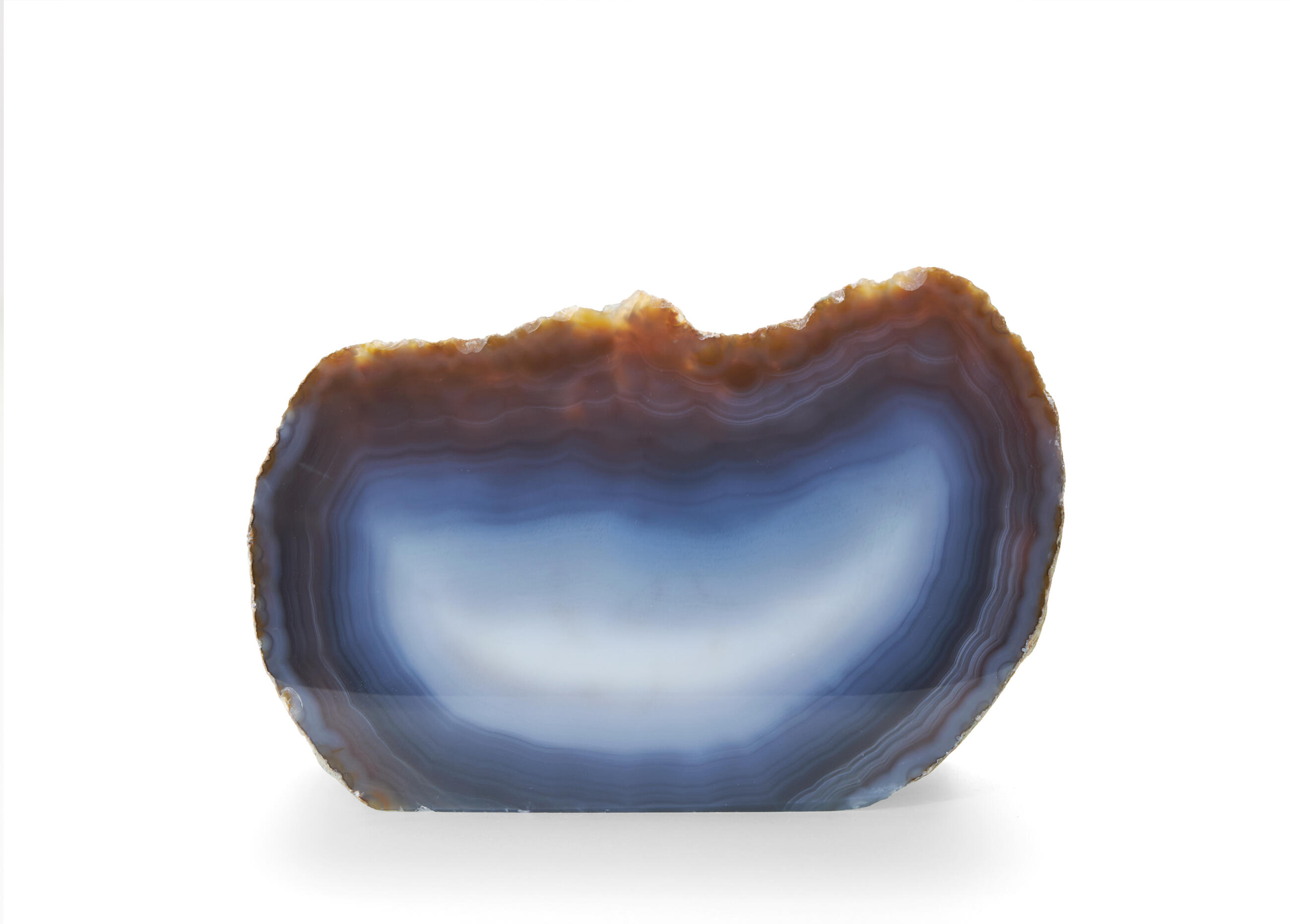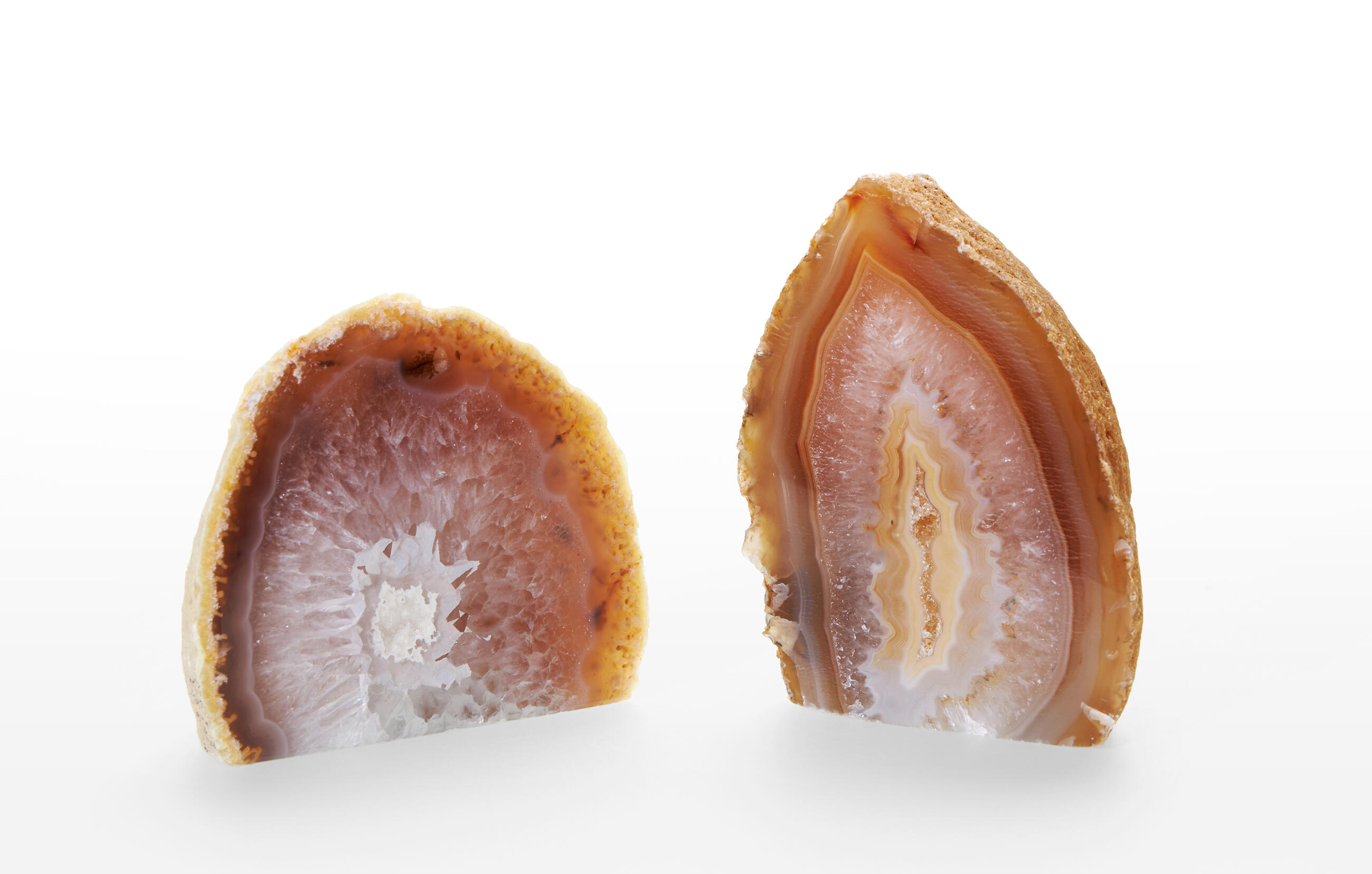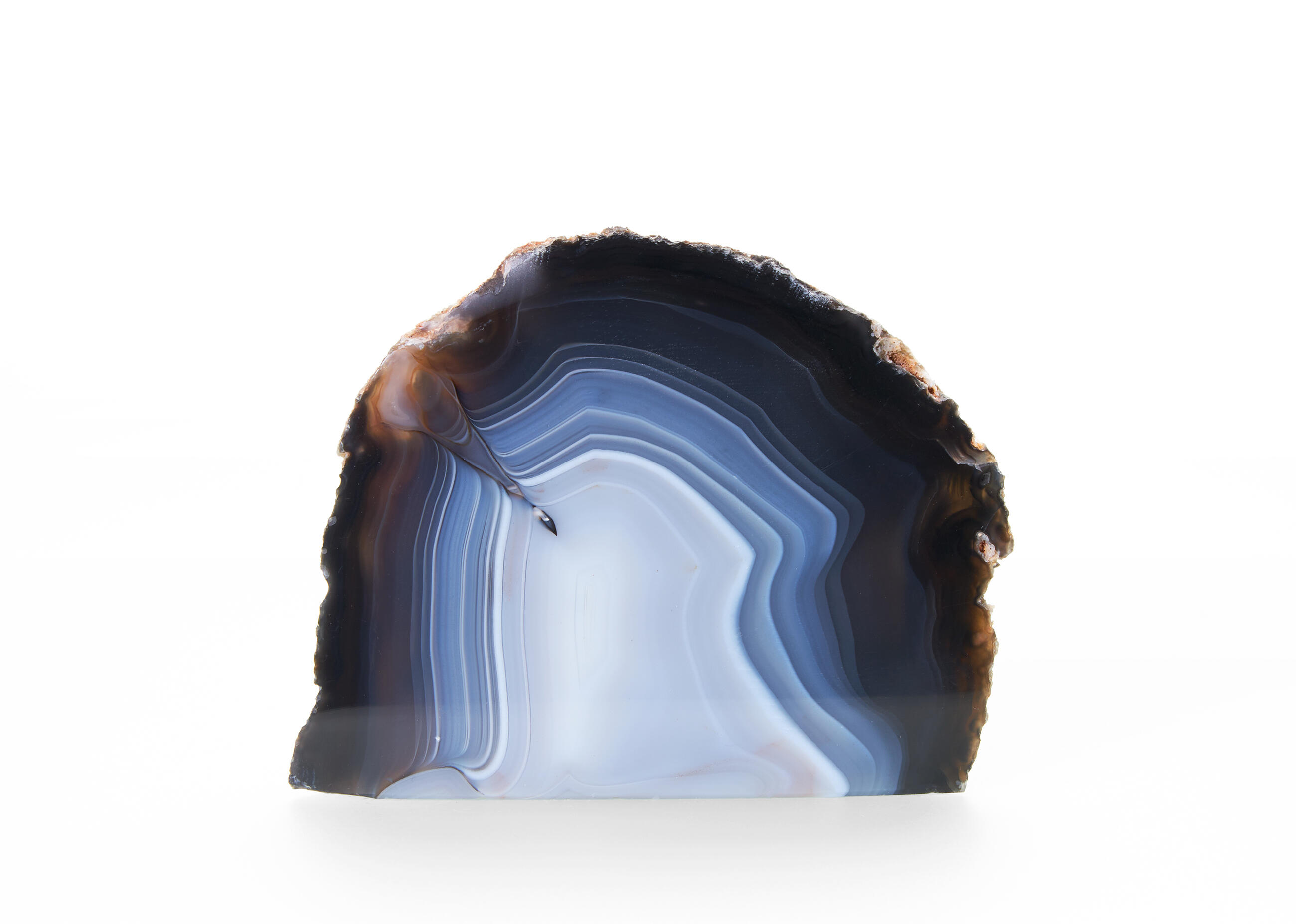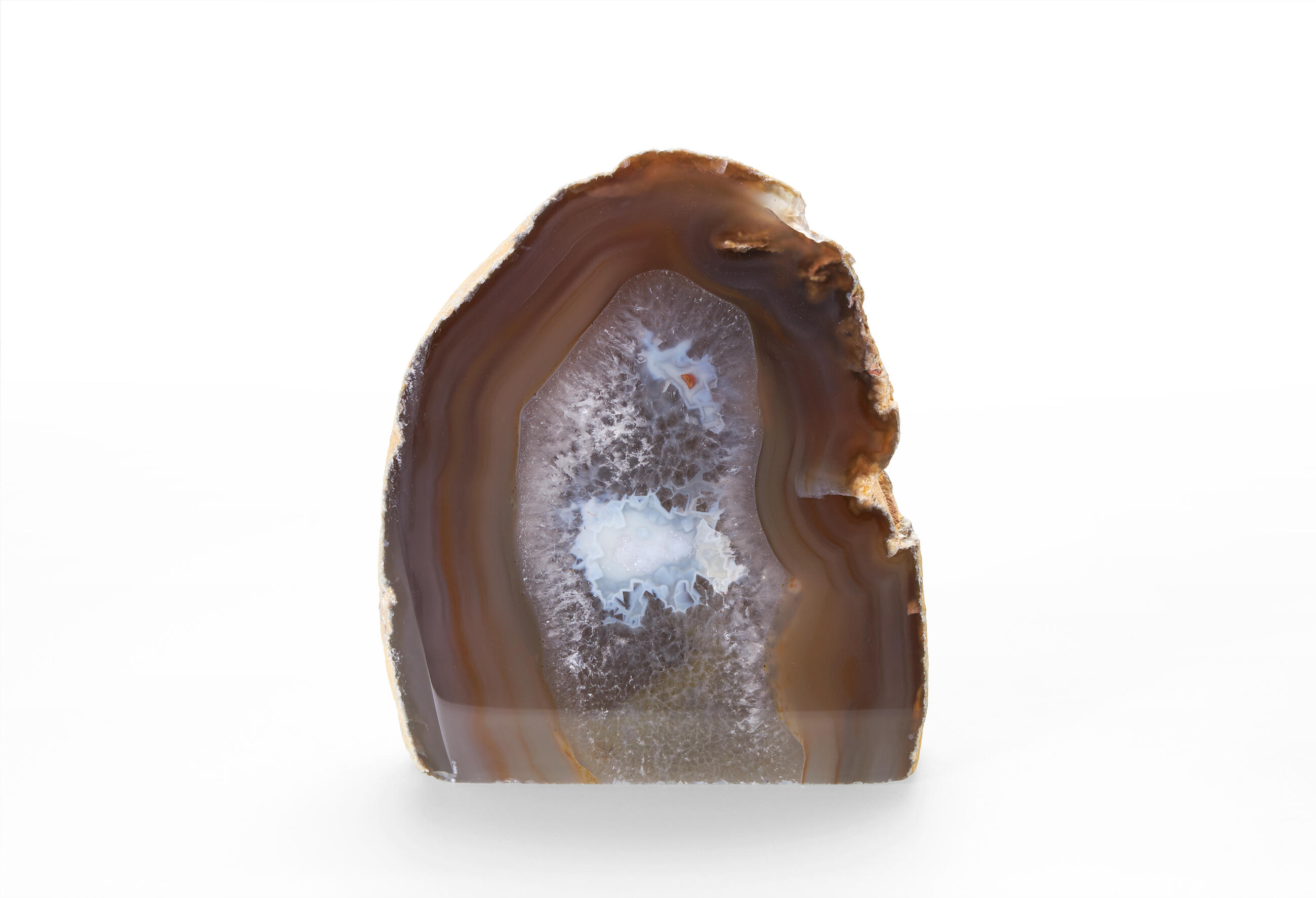 Agate is a mineral formed by tiny little layers of cryptocrystalline quartz, chalcedony and opal. The product represents a rough piece of agate cut in half; the front side has been polished and the bottom side has been cut and smoothed out in order to make stone stand solidly. Thanks to this treatment, the unique patterns and regular banded lines typical for this agate can stand out. Some varieties also have tiny cavities filled with little crystals of quartz. Our agates are from large mines in the state of Rio Grande do Sul in Brazil.