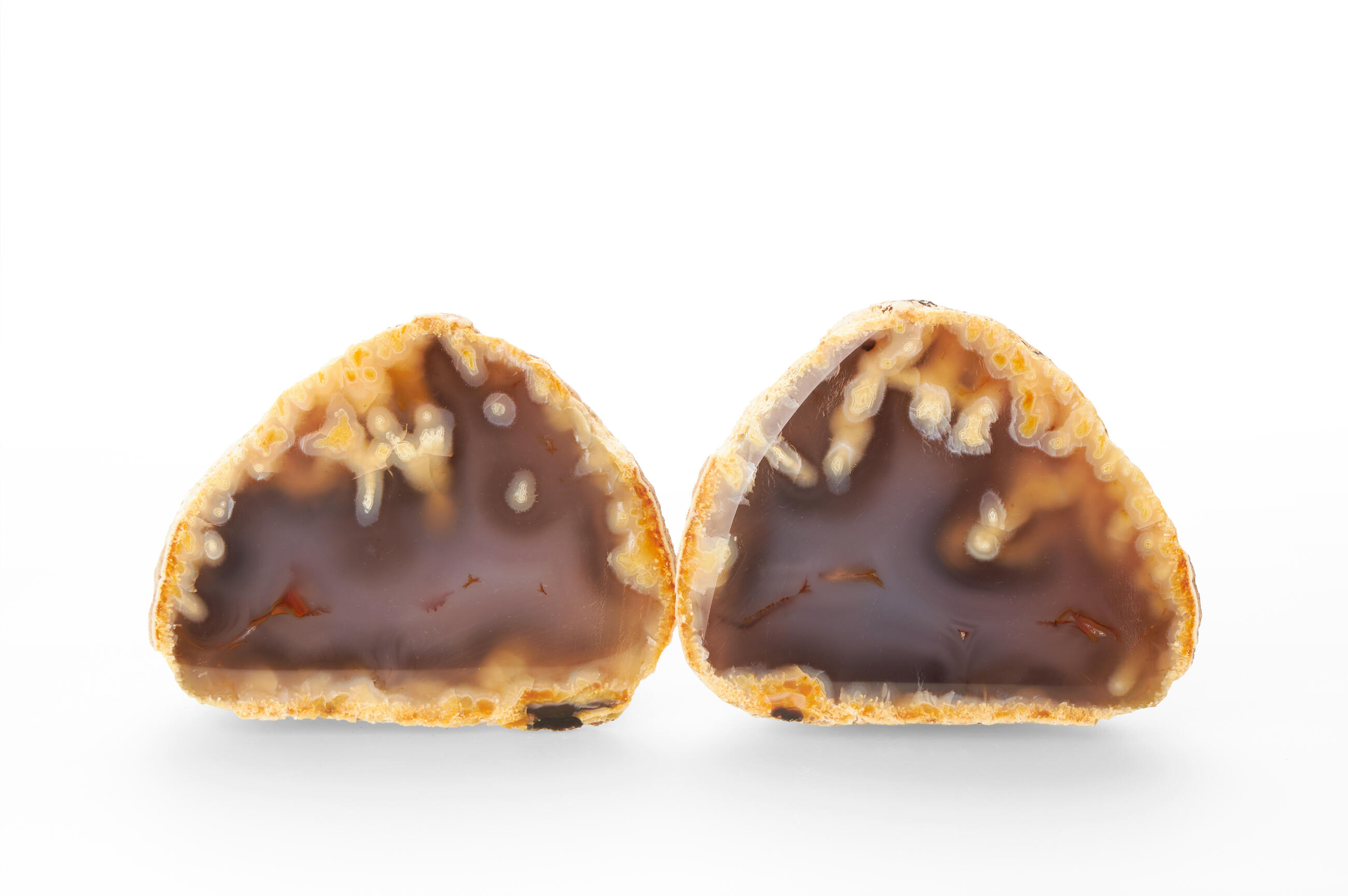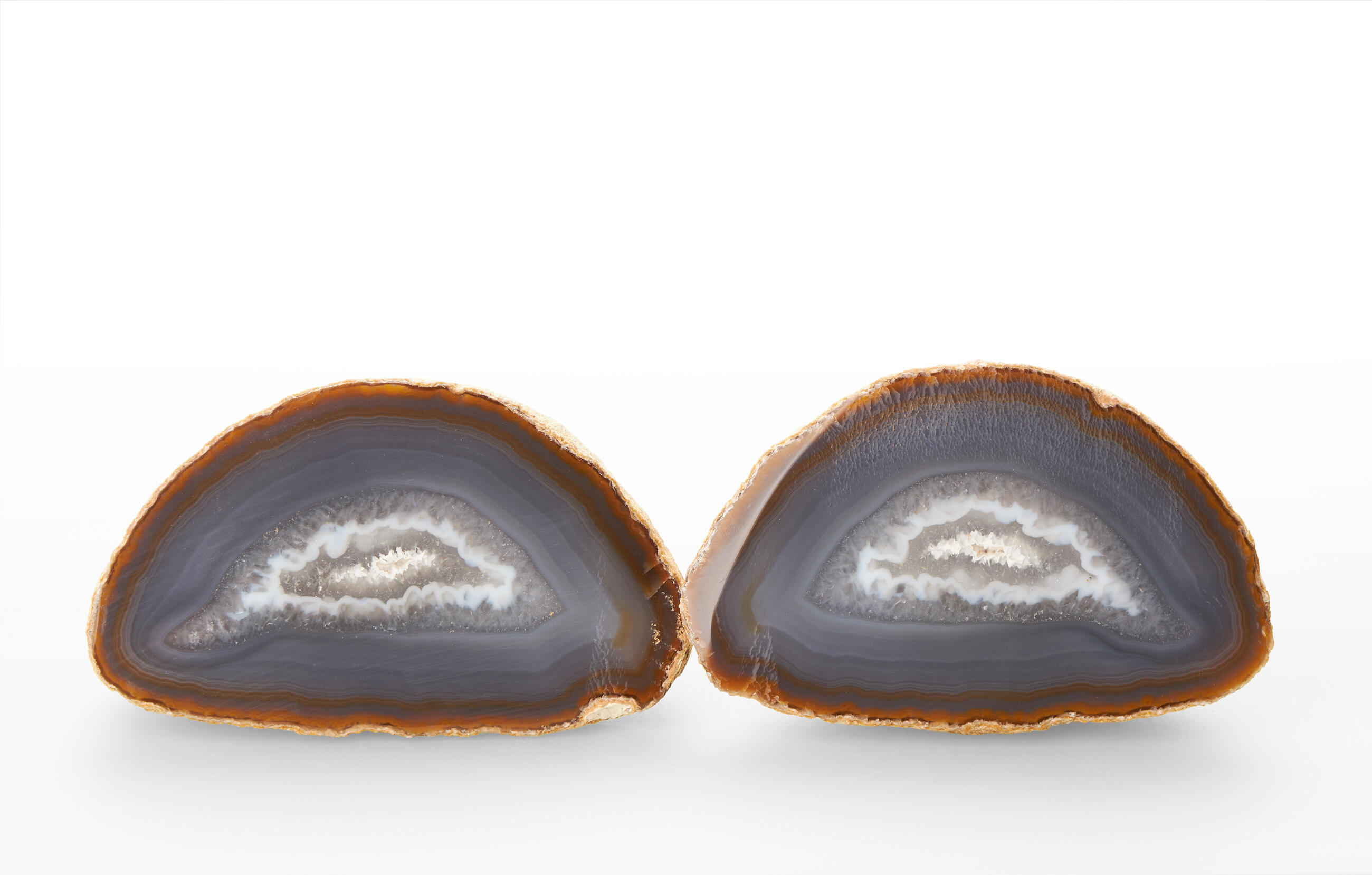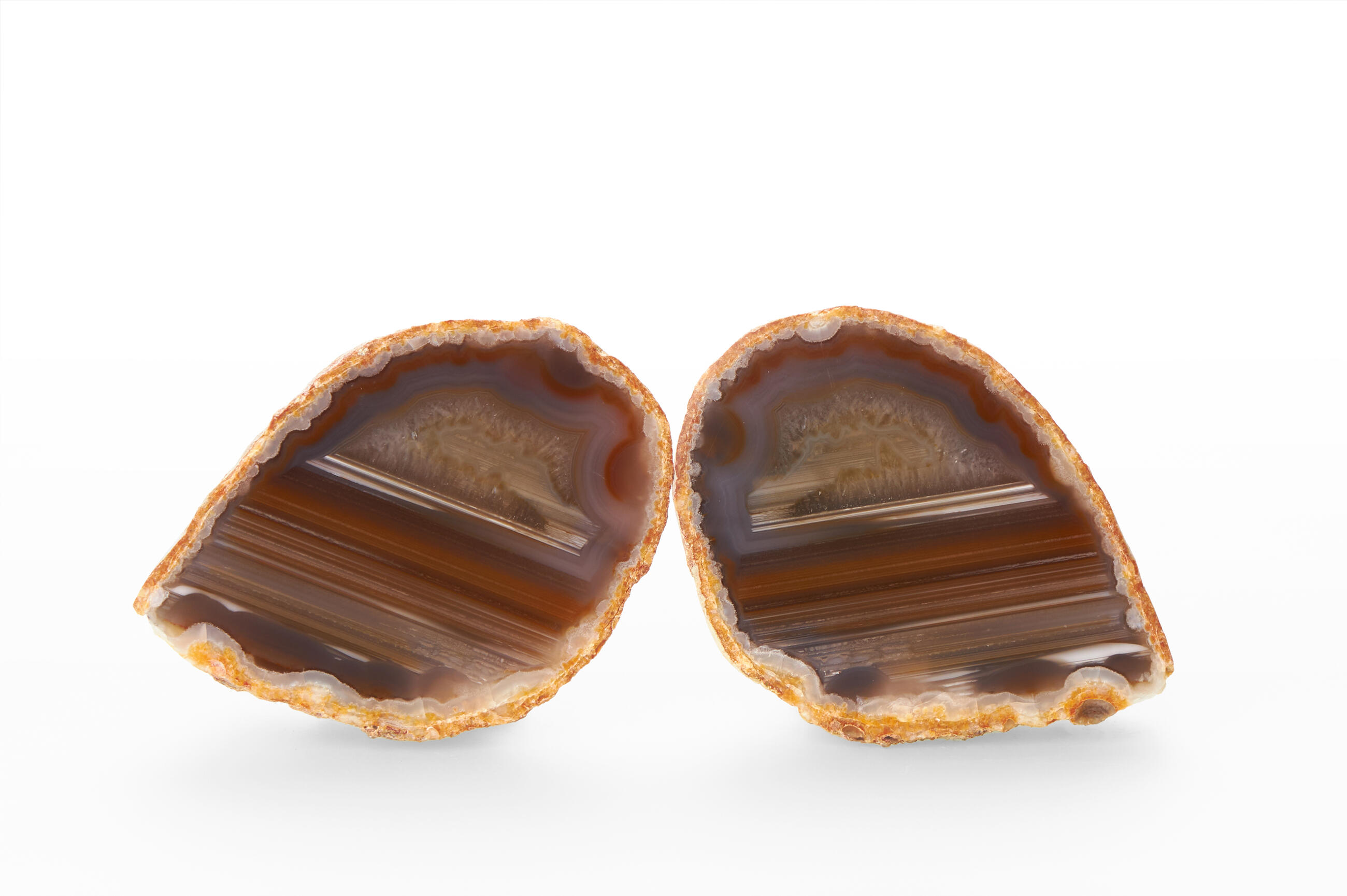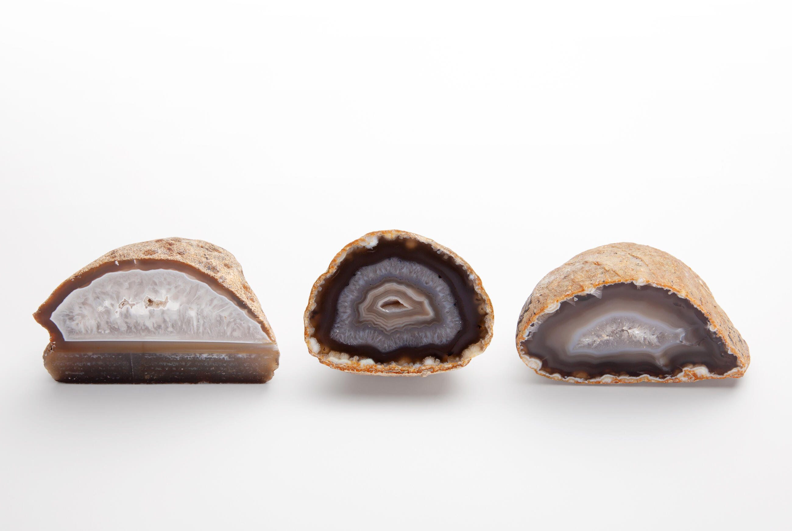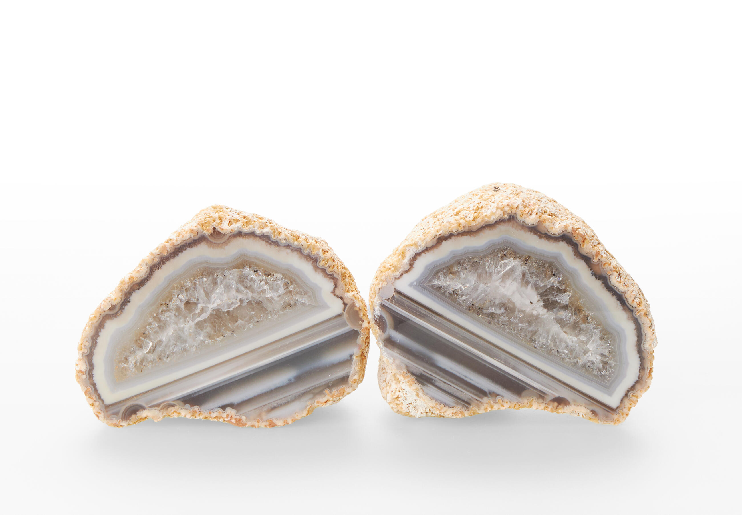 Rough agates, which have been cut in halves and polished from the front side. Thanks to this treatment, the unique patterns and regular banded lines typical of agates can stand out. Some varieties form tiny little cavities with small crystals of quartz. Our agates are from Brazilian mines in Rio Grande do Sul.