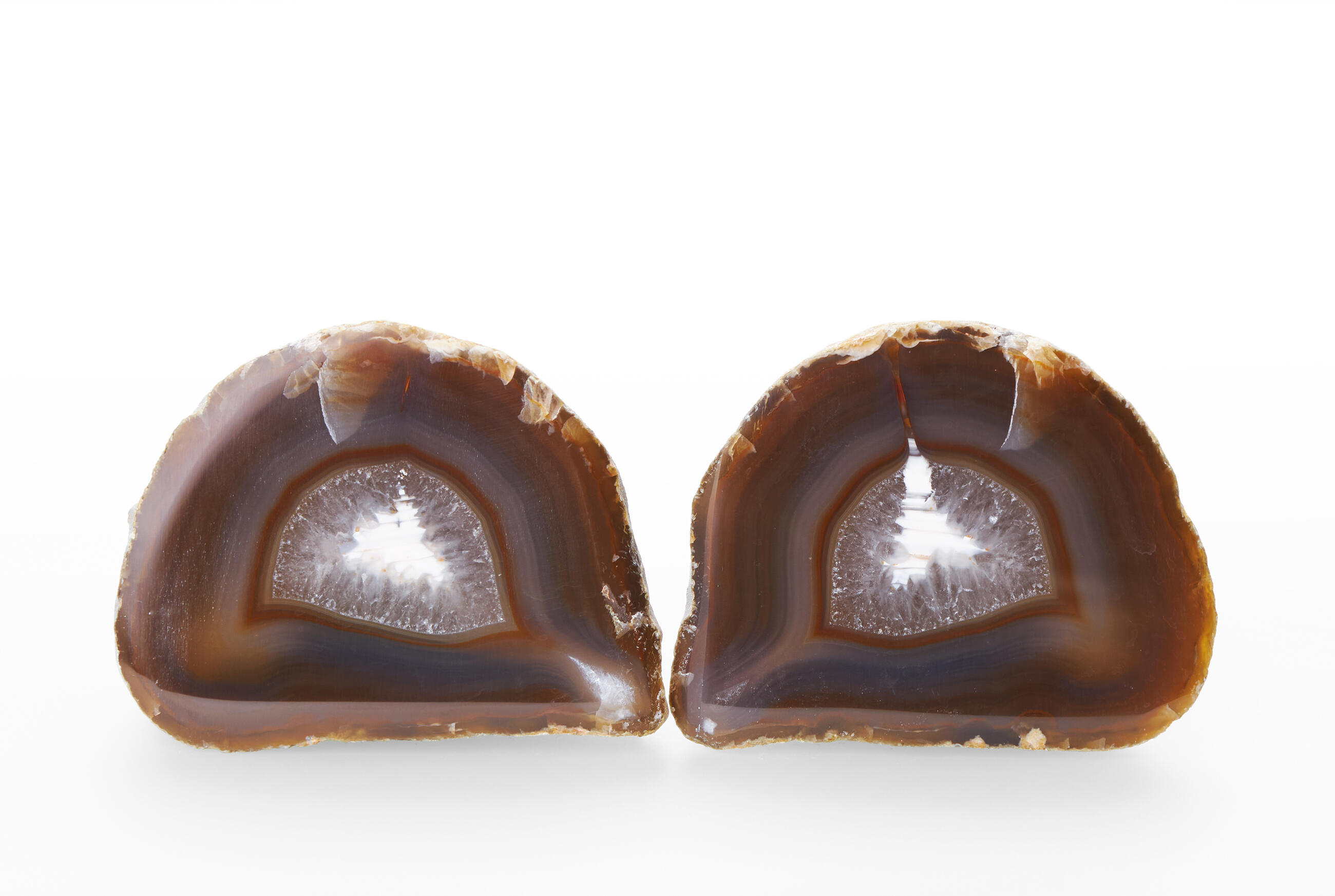 Rough agates, which have been cut in halves and polished from the front side. Thanks to this treatment, the unique patterns and regular banded lines typical of agates can stand out. Some varieties form tiny little cavities with small crystals of quartz. Our agates are from Brazilian mines in Rio Grande do Sul.