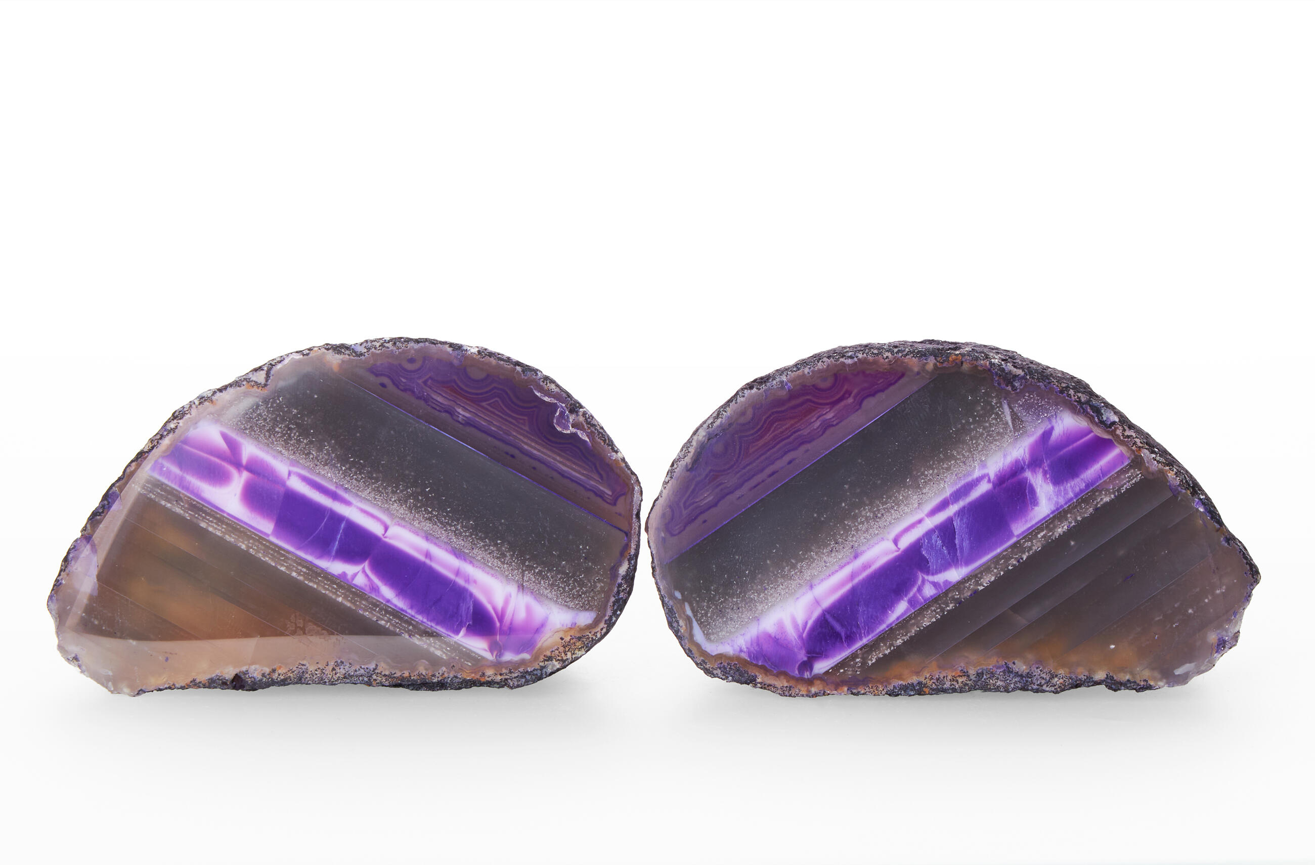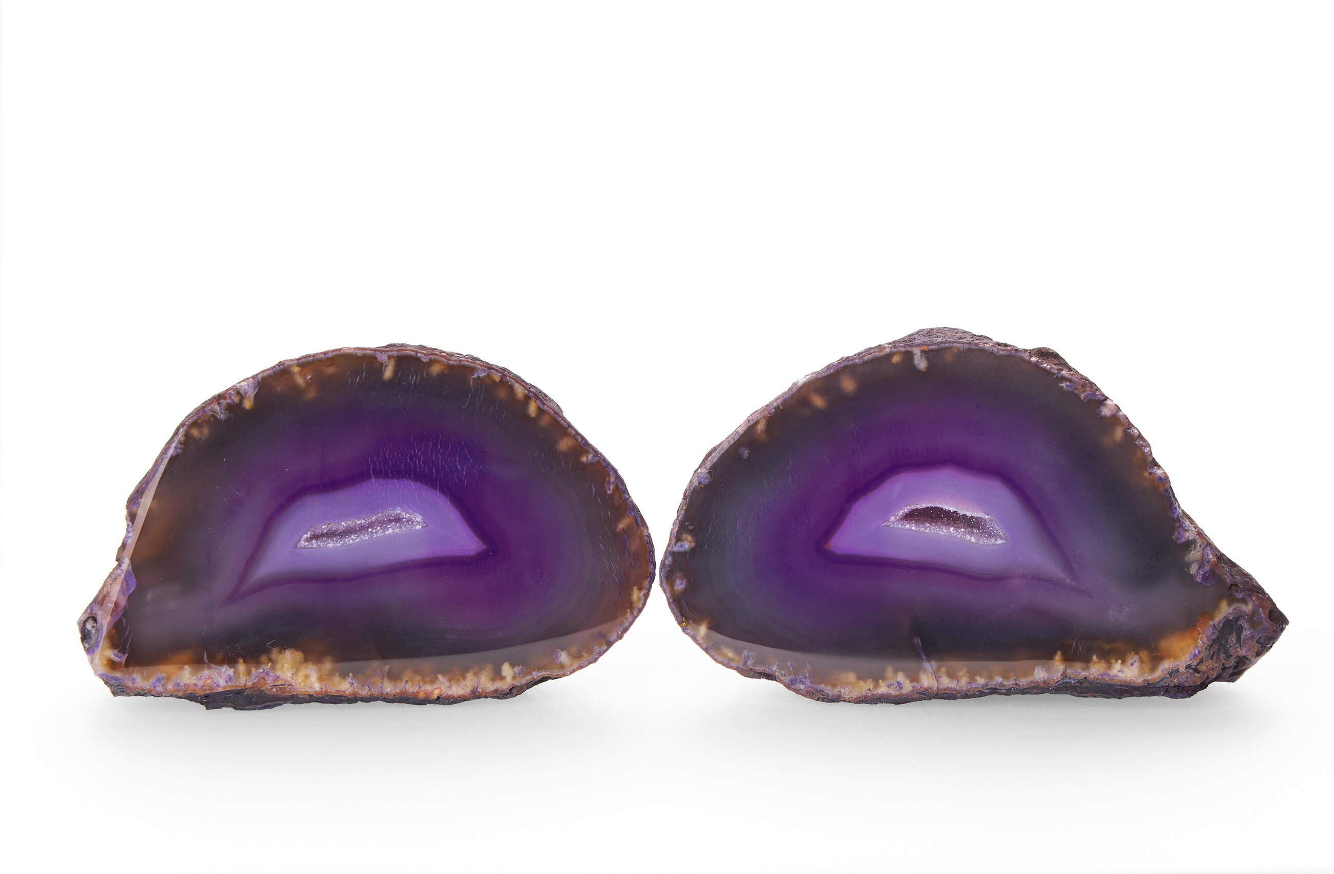 Rough agates, which have been cut in halves and polished from the front side. Thanks to this treatment, the unique patterns and regular banded lines typical of agates can stand out. Some varieties form tiny little cavities with small crystals of quartz. Our agates are from Brazilian mines in Rio Grande do Sul.