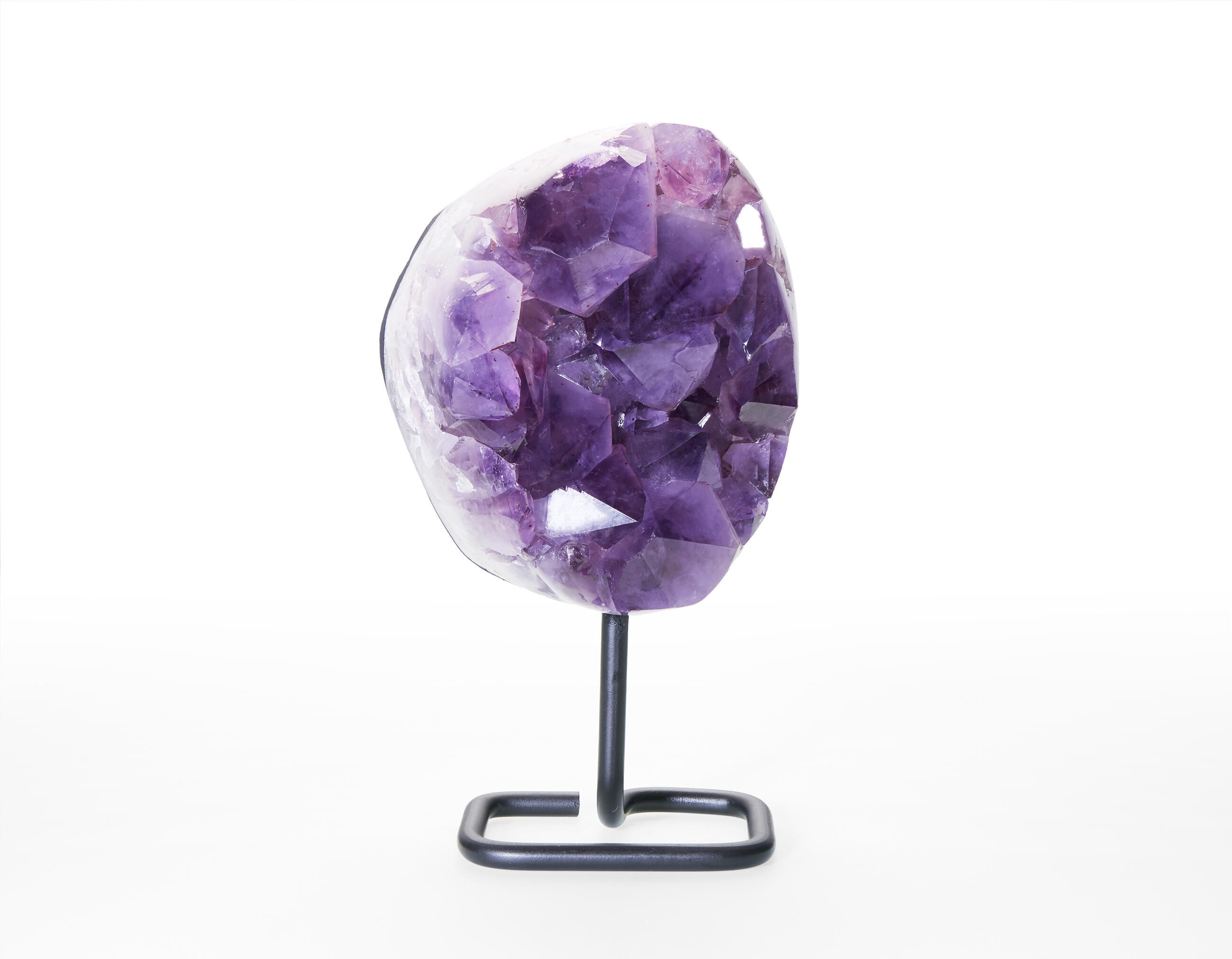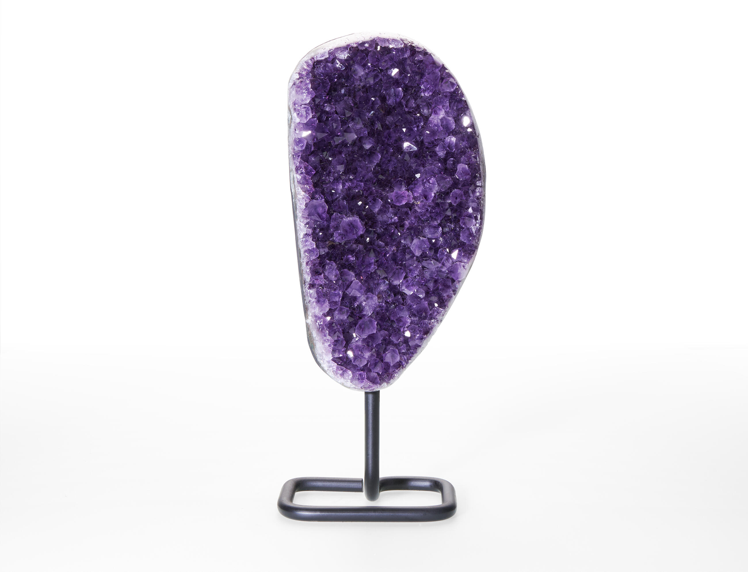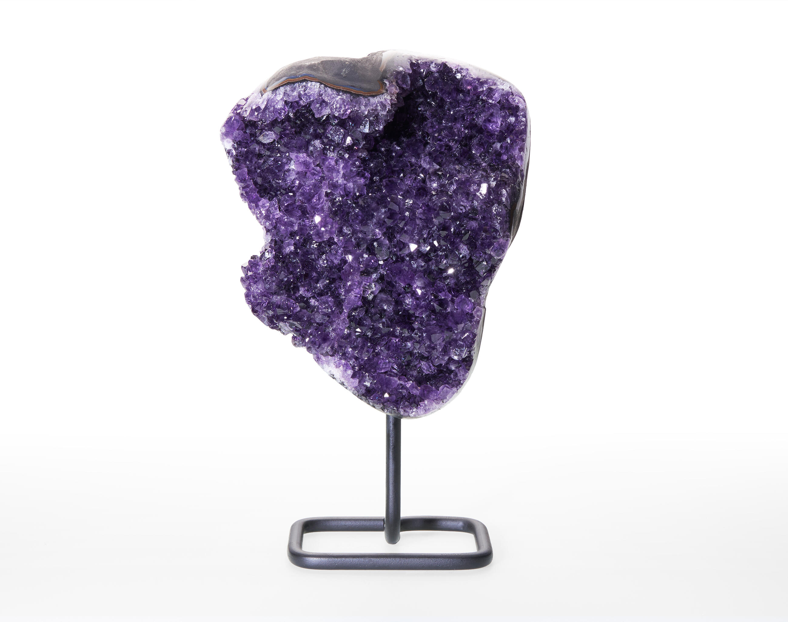 Druses are aggregates of crystals on the surface of a rock or mineral. Amethyst druses come from two deposits; druses with bigger and brighter crystals are from Brazil, while those with tiny, deep purple crystals are from the Artigas department in Uruguay.