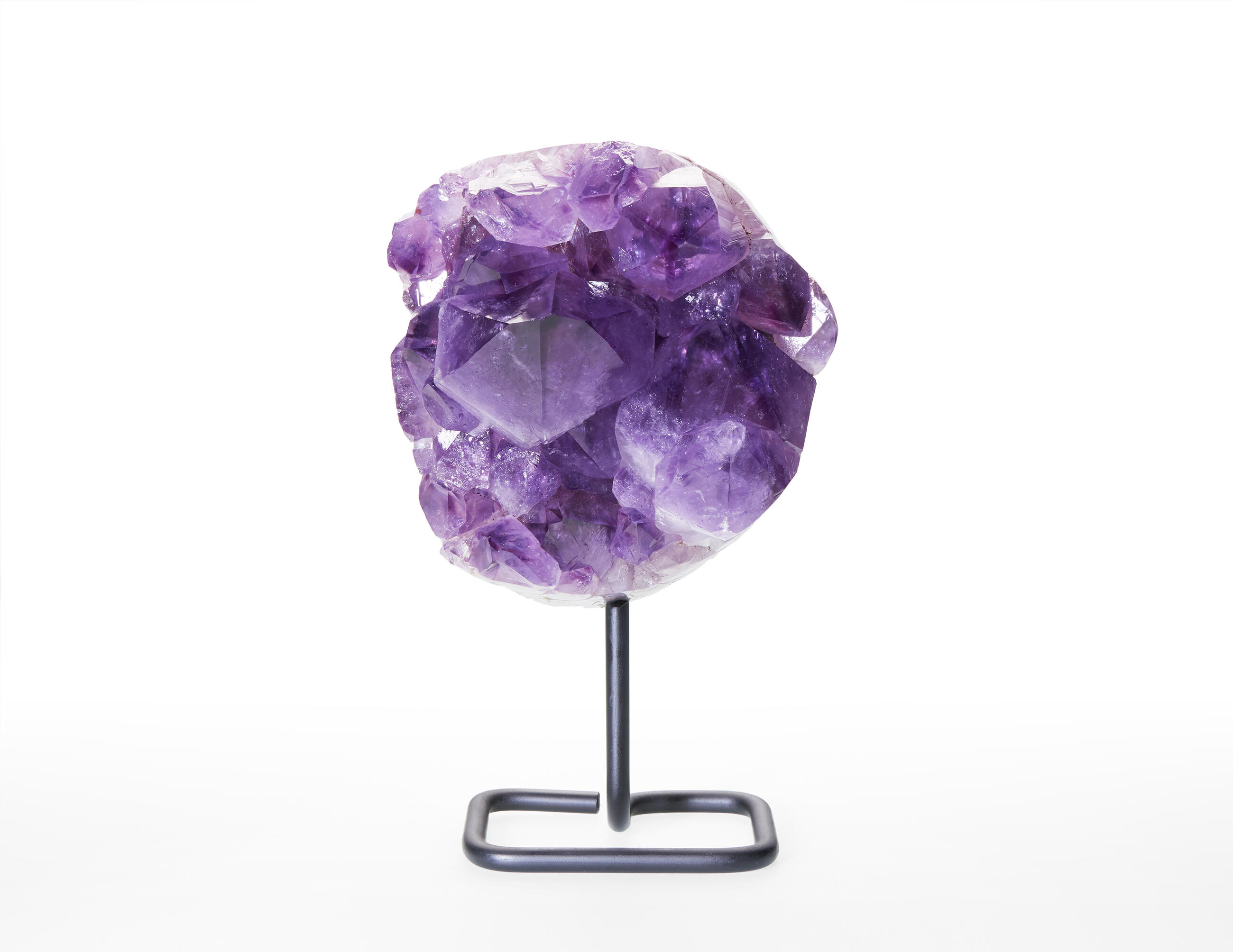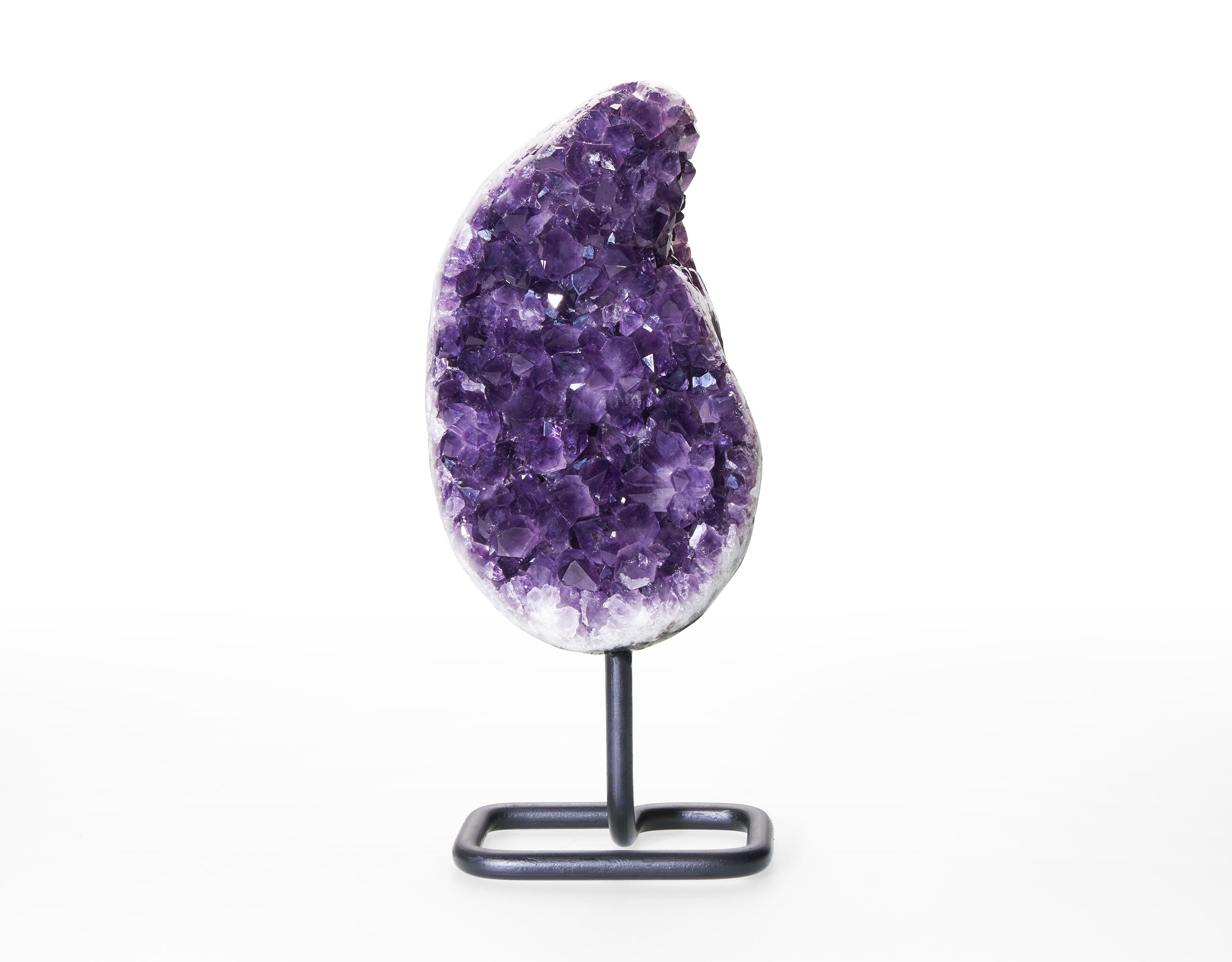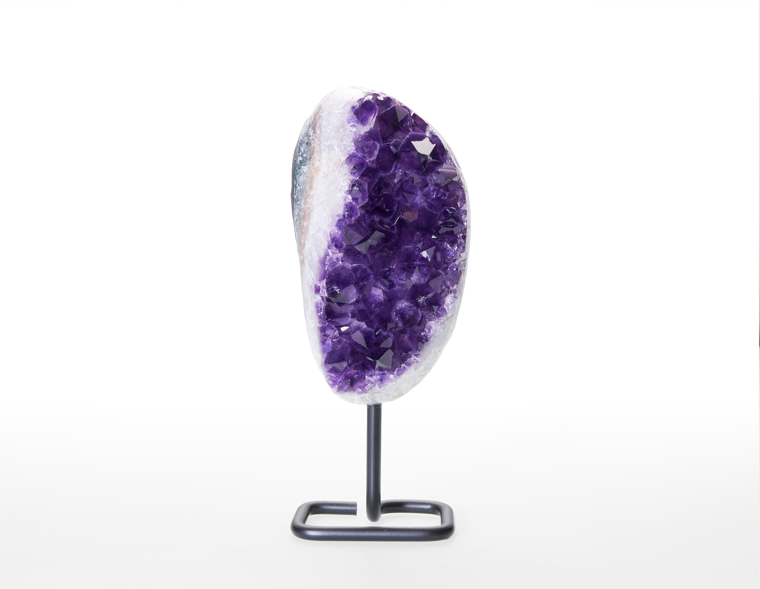 Druses are aggregates of crystals on the surface of a rock or mineral. Amethyst druses come from two deposits; druses with bigger and brighter crystals are from Brazil, while those with tiny, deep purple crystals are from the Artigas department in Uruguay.