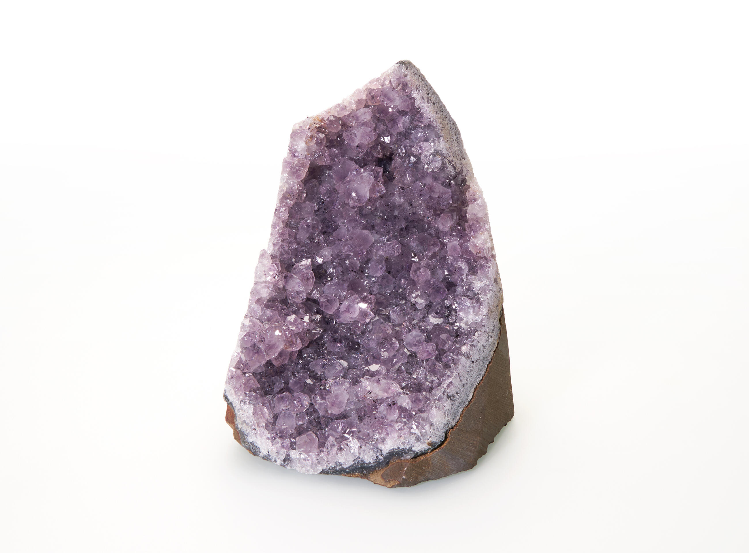 Druses are aggregates of crystals on the surface of a rock or mineral. These amethyst druses have a flat cut base and the sides of the mineral are often cut as well to boost the product's aesthetic value. The back of the stone remains in its natural form. These pieces come from the Artigas department in Uruguay, which is a location characteristic for amethysts with calcite formations growing on the surface of their crystals. In general, Uruguayan amethysts are typical for their stalactite growths and a dark purple colour.