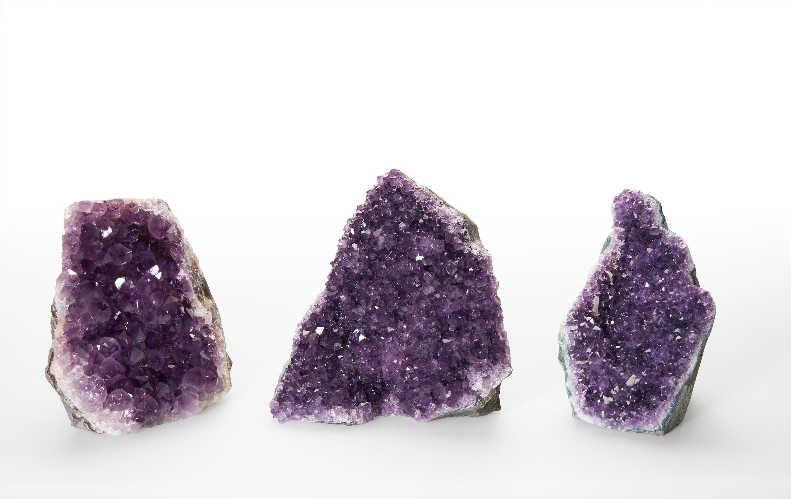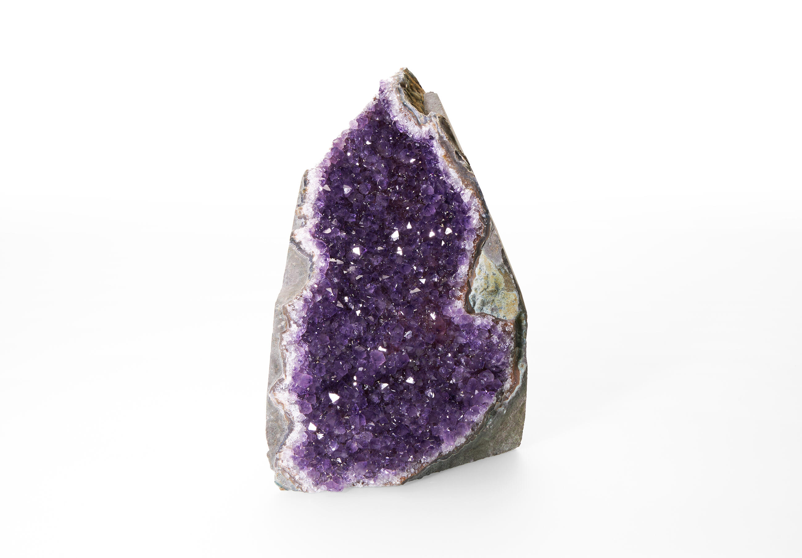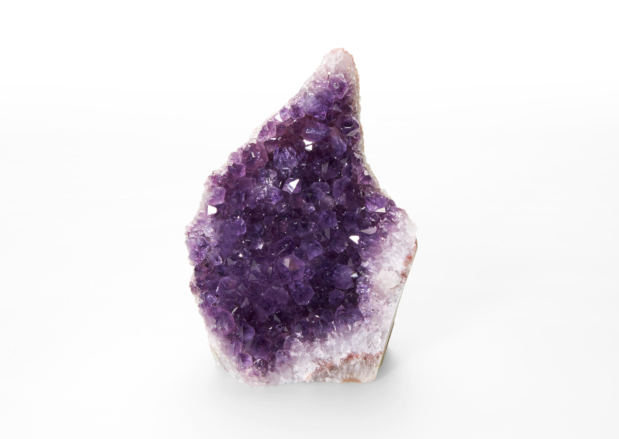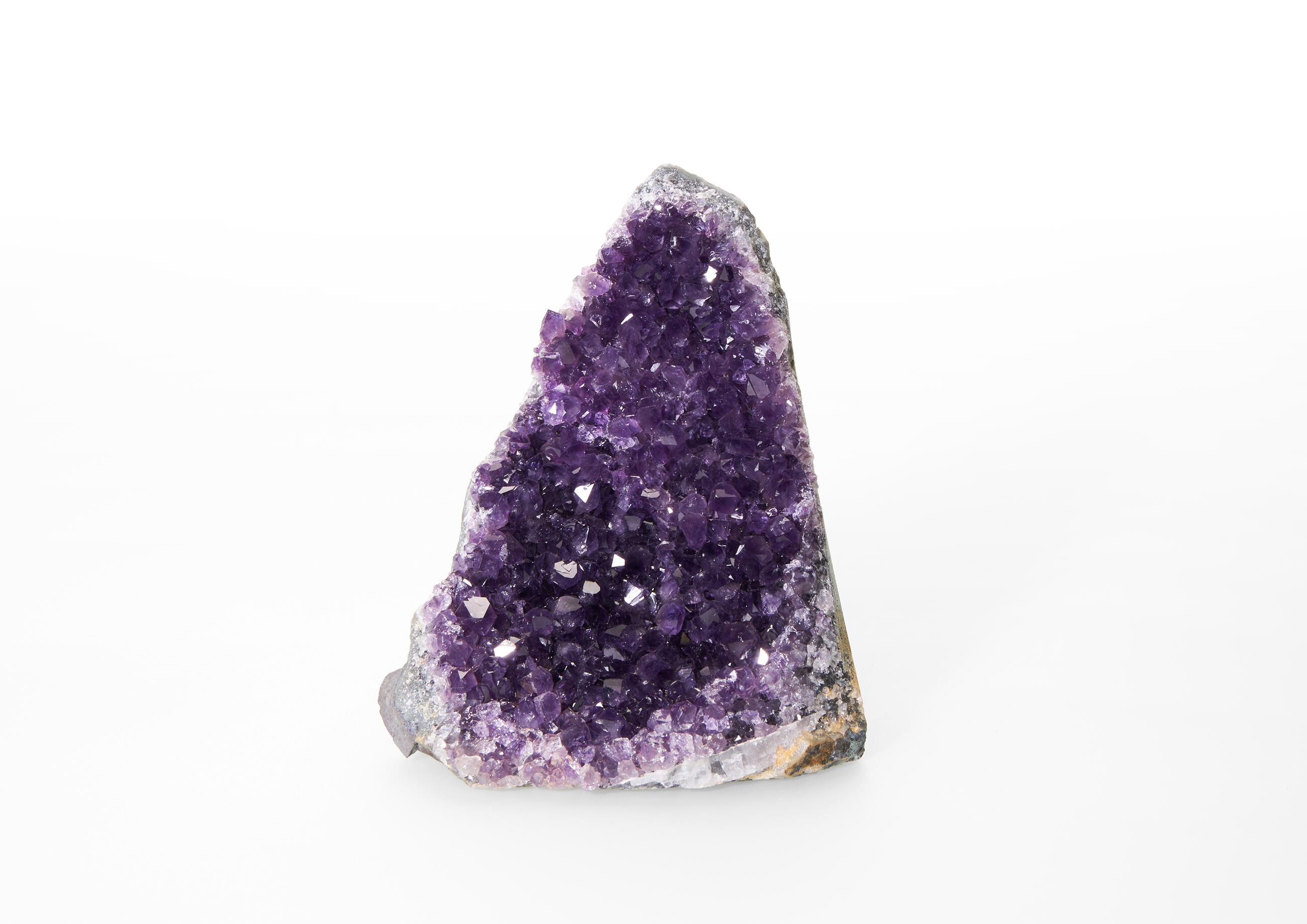 Druses are aggregates of crystals on the surface of a rock or mineral. These amethyst druses have a flat cut base and the sides of the mineral are often cut as well to boost the product's aesthetic value. The back of the stone remains in its natural form. These pieces come from the Artigas department in Uruguay, which is a location characteristic for amethysts with calcite formations growing on the surface of their crystals. In general, Uruguayan amethysts are typical for their stalactite growths and a dark purple colour. The EXTRA QUALITY (EXQ) is the highest quality level we offer.